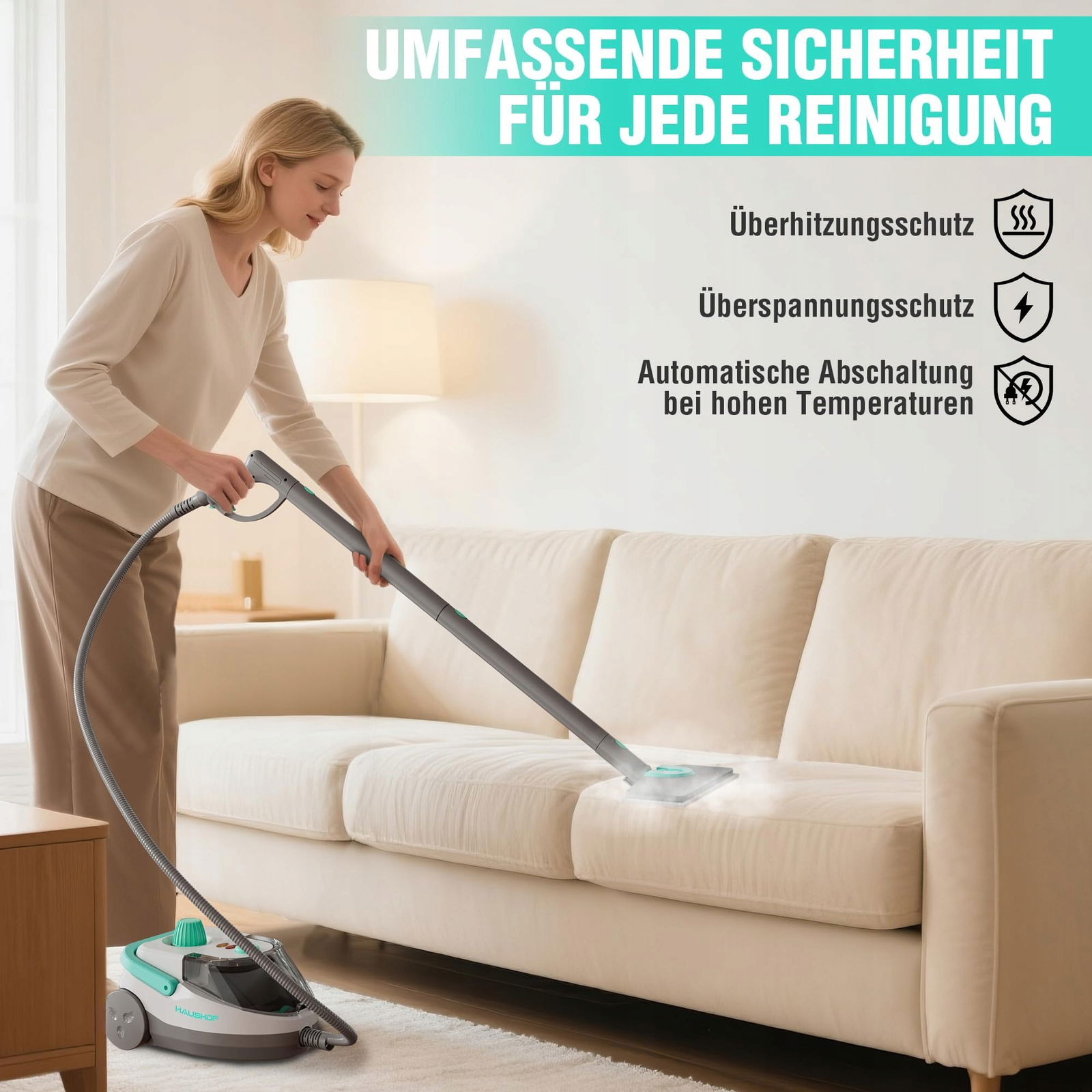 Parownica HAUSHOF HH24130 wyposażona jest w moc 1800W, która przekłada się na szybkie nagrzewanie w ciągu 7-9 minut. Duży zbiornik o pojemności 1.5 litra umożliwia do 30 minut ciągłego strumienia pary, co jest idealne do większych porządków. Stałe, wysokie ciśnienie pary do 4.0 Bar oraz wydajność 45 g/min skutecznie usuwają brud i zapewniają higieniczną czystość. Temperatura wylotowa pary sięgająca 105 °C pozwala na dezynfekcję powierzchni.