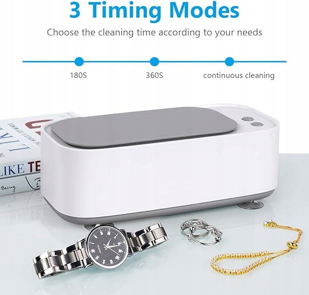 - ∢3-poziomowa funkcja pomiaru czasu: Korzystając z 3-poziomowej funkcji pomiaru czasu, możesz ustawić czas czyszczenia na 180 sekund w przypadku regularnego czyszczenia lub 300 sekund w przypadku intensywnego czyszczenia. W zależności od sposobu użytkowania, elastyczna konstrukcja umożliwia czyszczenie różnego rodzaju biżuterii.