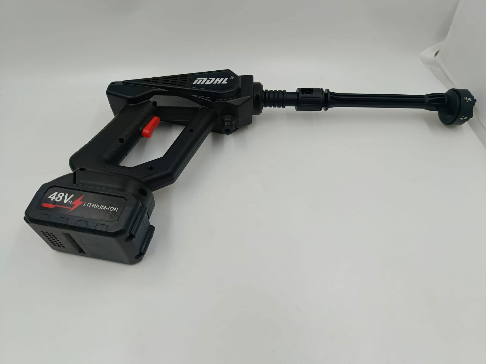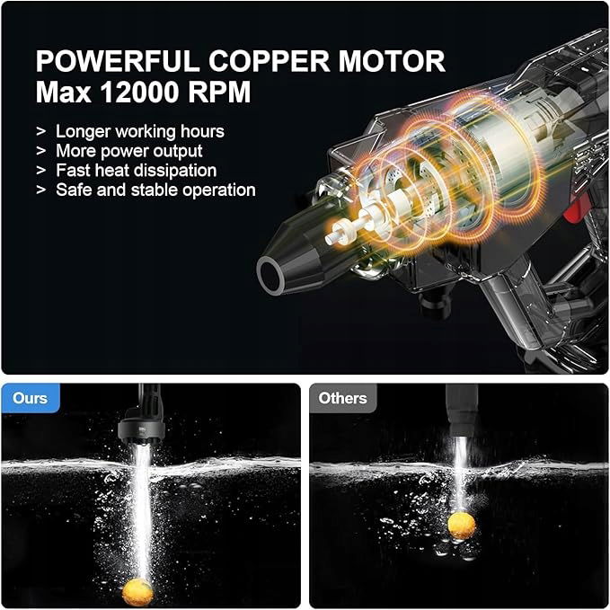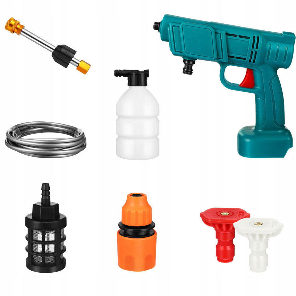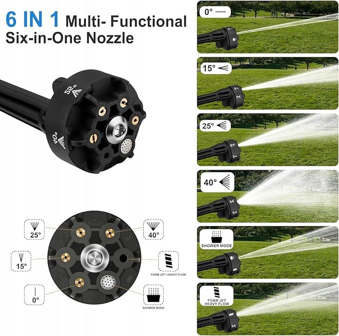 - Wielofunkcyjna dysza 6 w 1: zestaw myjki ciśnieniowej na baterie jest wyposażony w dyszę 6 w 1: 0°, 15°, 25°, 40°. Miedziany silnik jest zaprojektowany tak, aby zapewnić silne ciśnienie wody dla tej bezprzewodowej myjki ciśnieniowej, a strumień wody można dowolnie przełączać na strumień bezpośredni pod wysokim ciśnieniem, strumień wachlarzowy lub strumień prysznicowy. Wielofunkcyjna konstrukcja dyszy oferuje wiele trybów, aby sprostać różnym potrzebom.