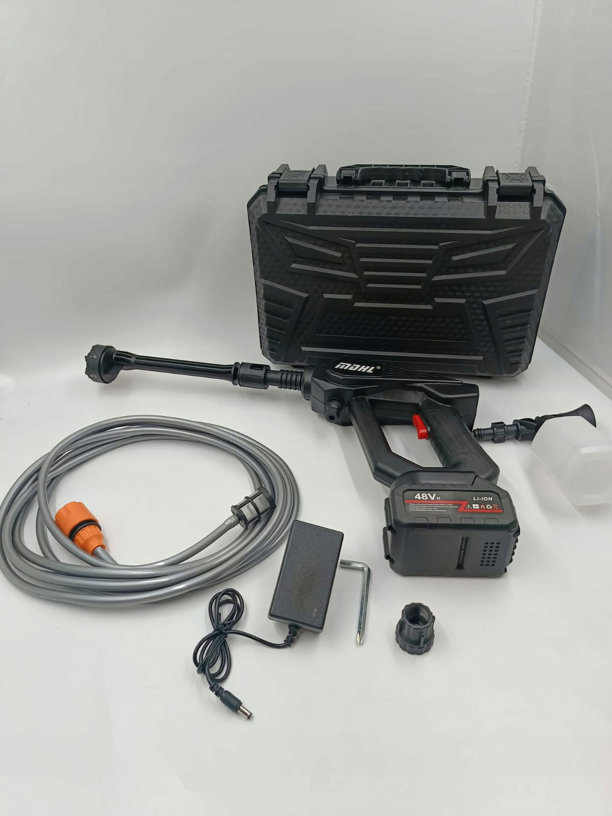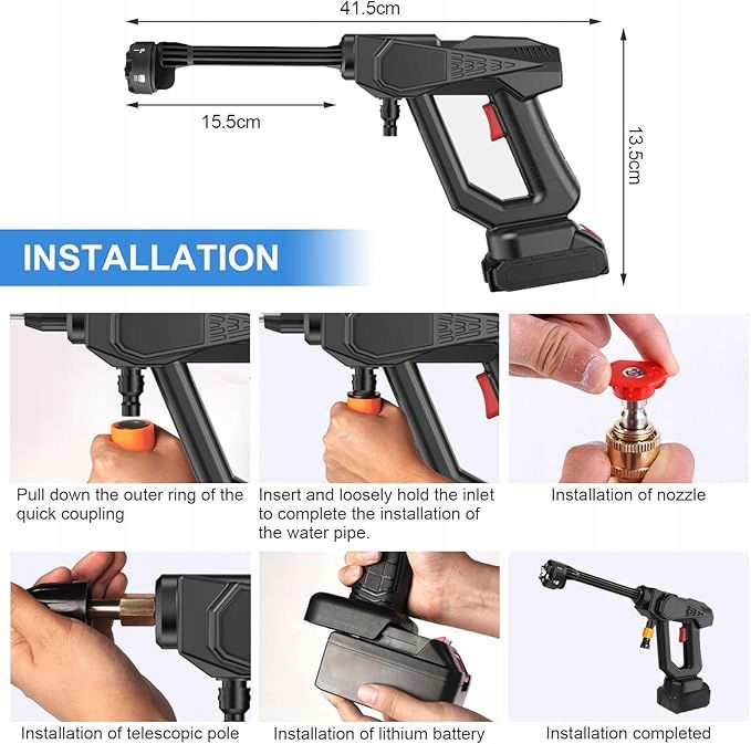 - Akumulator: ta przenośna myjka ciśnieniowa jest wyposażona w 1 akumulatory 24 V 6000 mAh, które można wymieniać według potrzeb. Akumulator zapewnia dłuższą żywotność i większą trwałość, żywotność baterii do 30 minut. Inteligentne włączanie/wyłączanie za naciśnięciem przycisku, skutecznie wydłużające żywotność silnika.