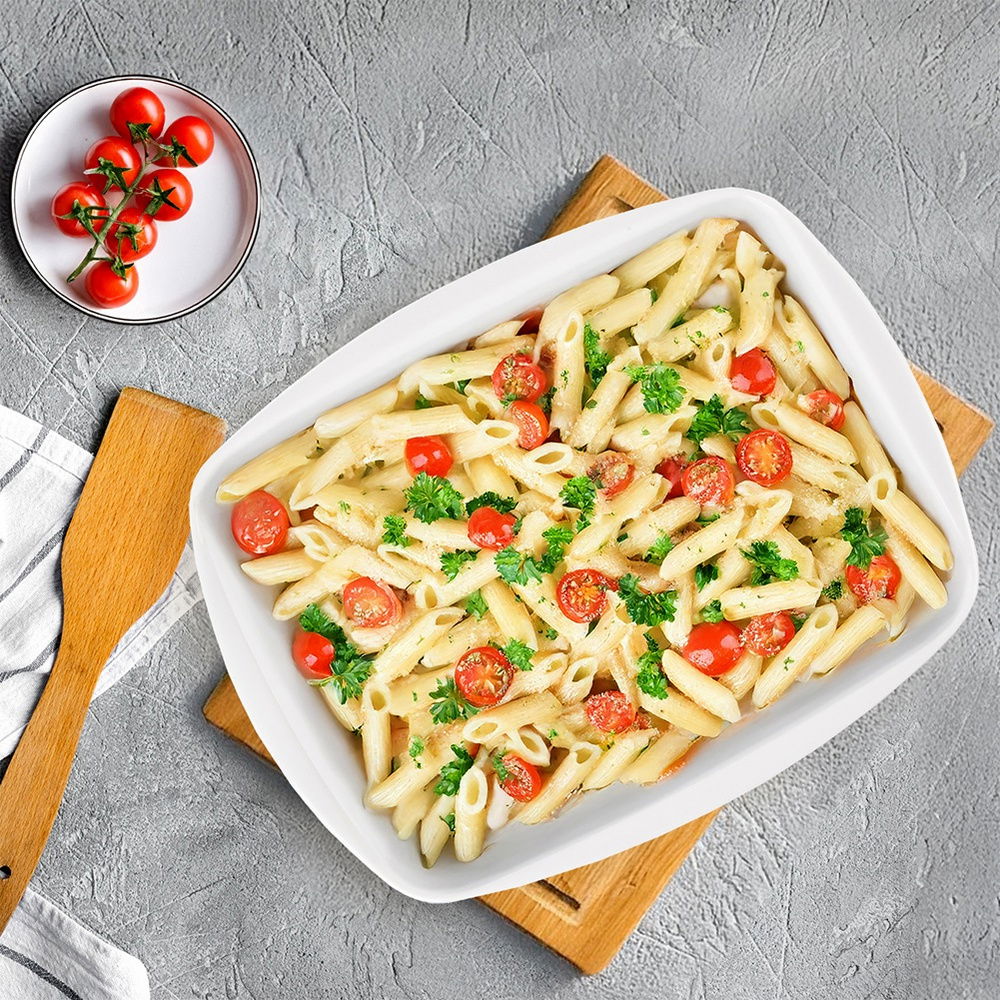 Duże naczynie żaroodporne do zapiekania. Wewnętrzna gładka powierzchnia ułatwi wyciąganie dań oraz mycie naczynia. Sprawdzi się do zapiekania różnego typu dań w piekarniku, przechowywania ich w lodówce, a nawet późniejszego ich podgrzewania w mikrofalówce. Będzie również dobrym pomocnikiem podczas letniego grillowania, może posłużyć jako miska do przechowywania zamarynowanego mięsa lub miska na sałatki.
