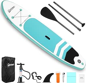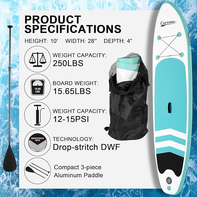 Bezpieczna i wygodna konstrukcja: 305 x 76 x 15 cm, Caroma Stand Up Paddle Board ma nośność 100 kg, dzięki czemu dzieci, młodzież i dorośli na wszystkich poziomach umiejętności mogą cieszyć się sportami wodnymi w zbiornikach wodnych, rzekach, jeziorach i spokojnych morzach. Wyjątkowo szeroka konstrukcja i antypoślizgowa konstrukcja z pianki EVA zapewniają długoterminową stabilność i bezpieczeństwo.