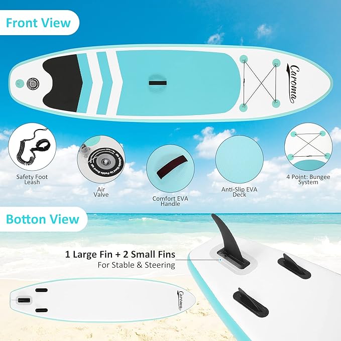 Doskonałe wykonanie i wysokiej jakości paddleboard: Caroma Inflatable Stand Up Paddleboarding zapewnia maksymalne bezpieczeństwo i wysokiej jakości deskę sup, która pozwala na swobodne poruszanie się i zabawę na wodzie. Deska wiosłowa wykorzystuje zaawansowaną technologię tkania, a strona wykorzystuje trójwarstwową technologię pogrubionej igły. Szwy są szczelne i nie przeciekają, zapewniając stabilność i równowagę.