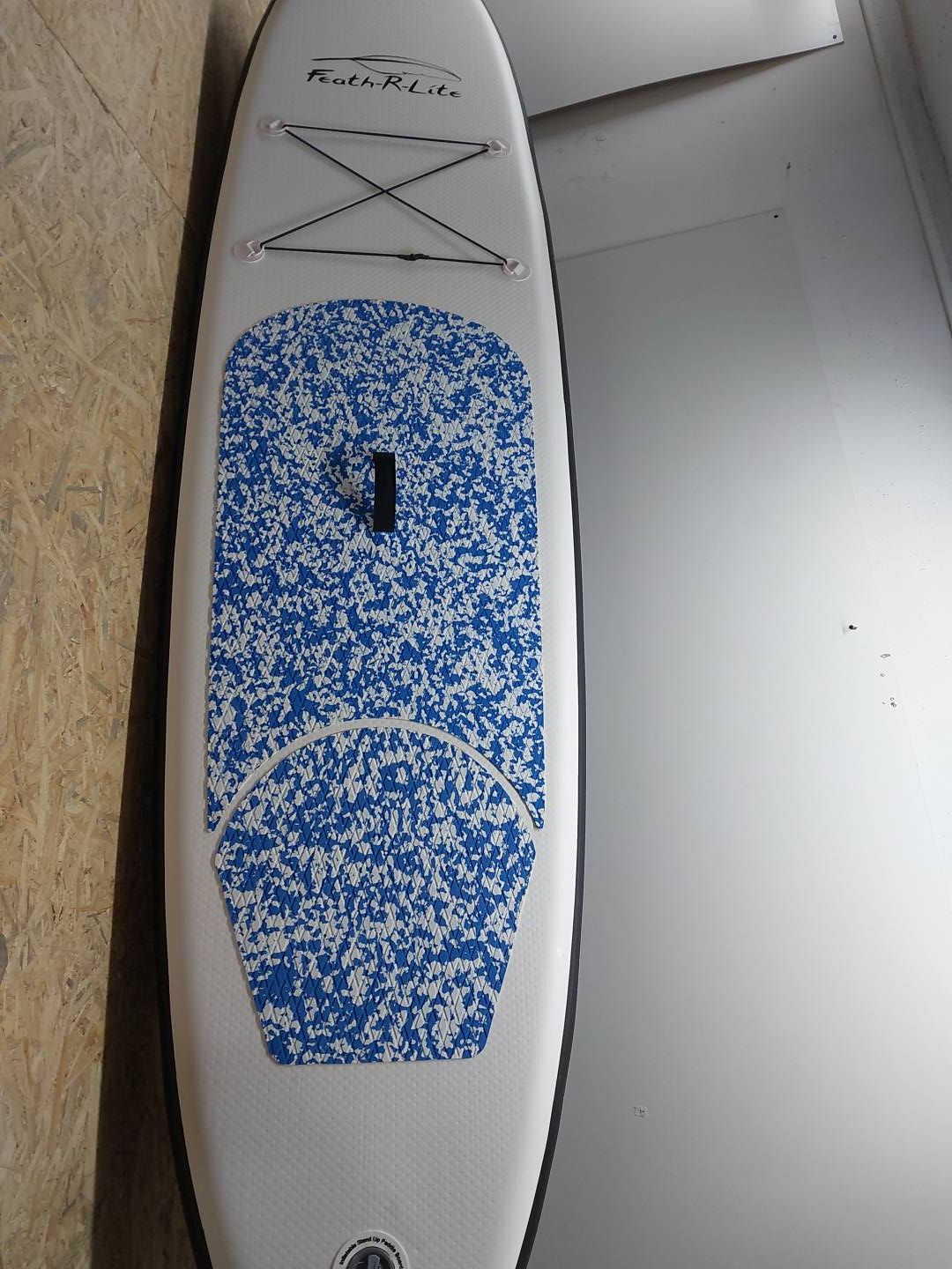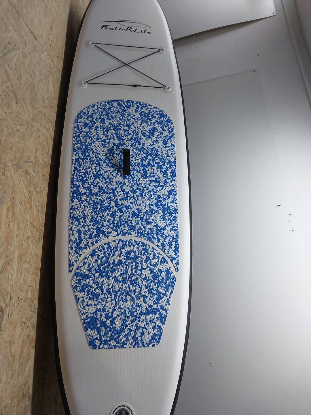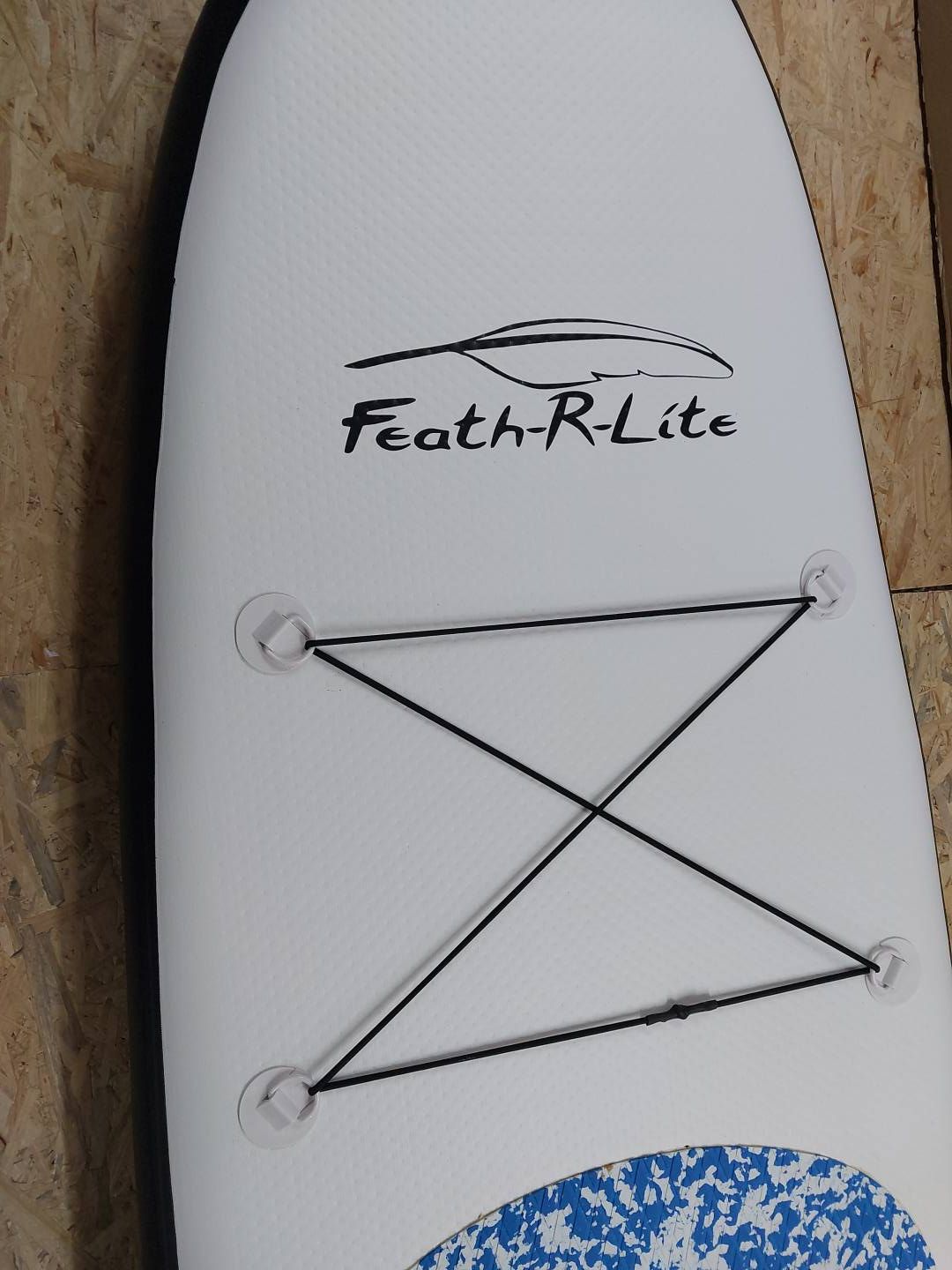 SUP FEAT-R-LITE POSIADA NIEWIELKIE PRZYTARCIA. PRODUKT WYPOSAŻONY JEST WE WSZYSTKIE NIEZBĘDNE AKCESORIA, JEDNAK BRAKUJE JEDNEGO ZABEZPIECZENIA DO PŁETWY ORAZ ZRYWKI.