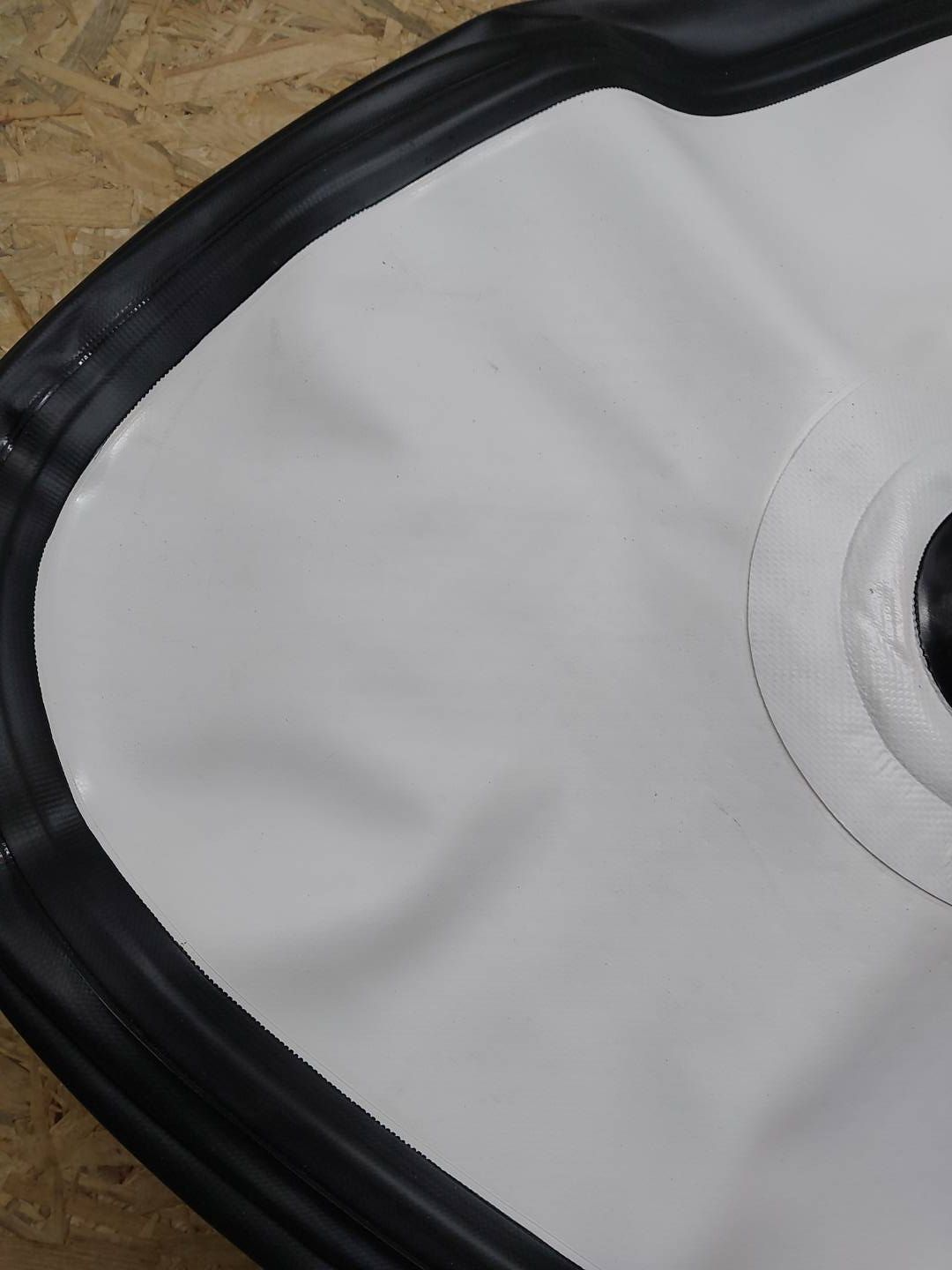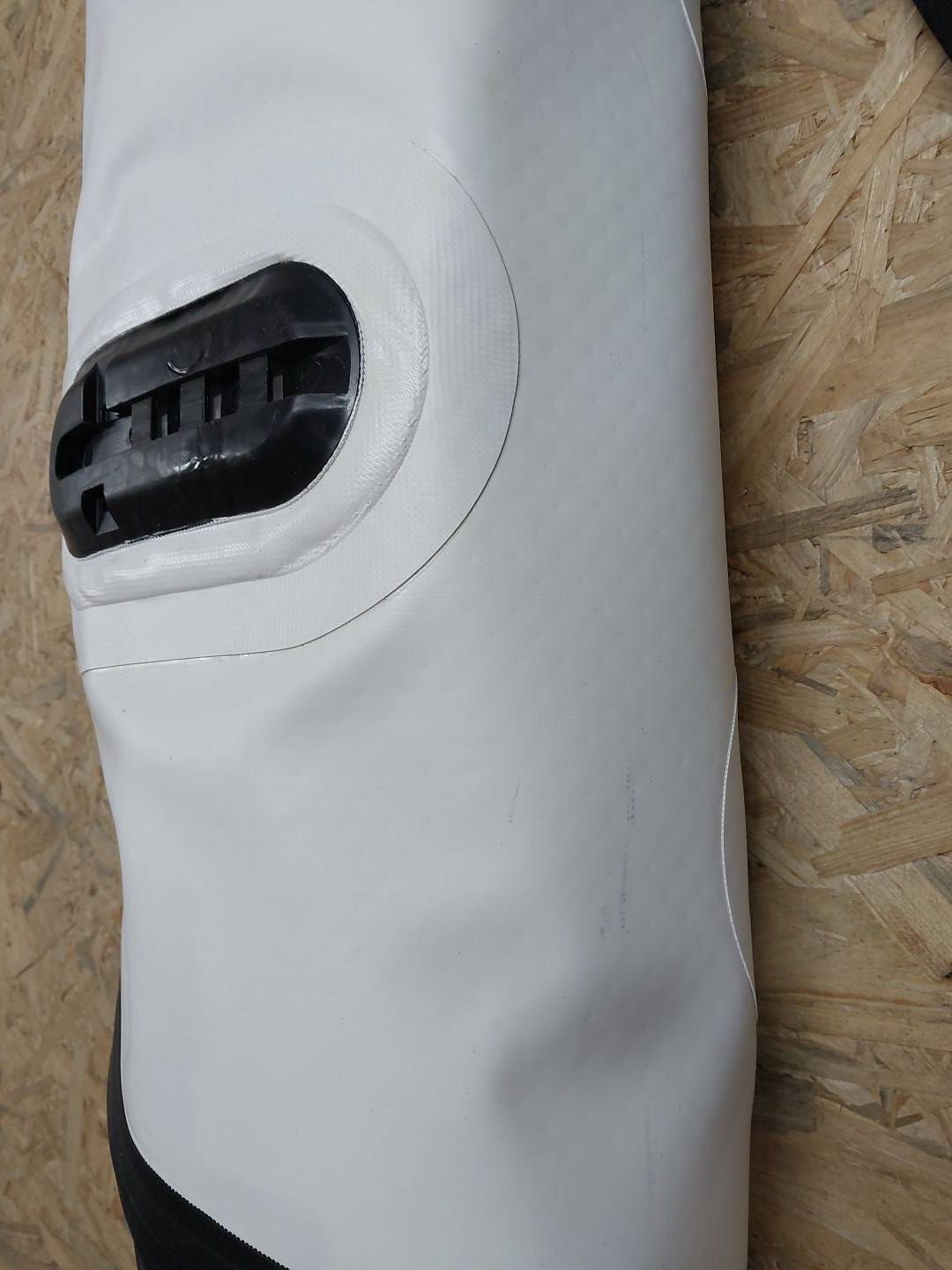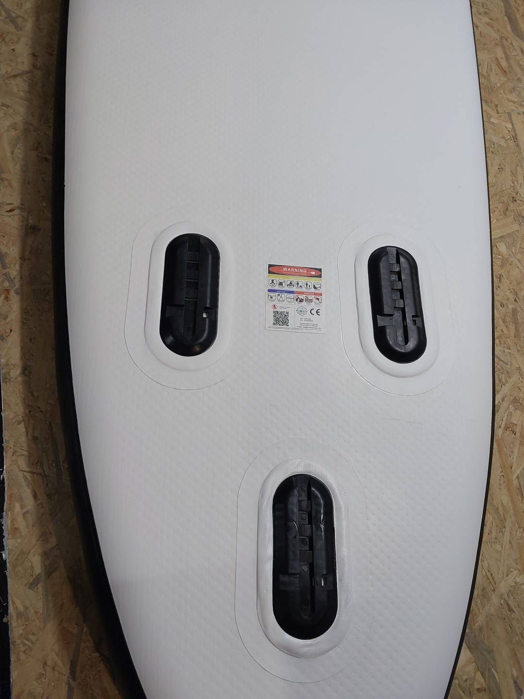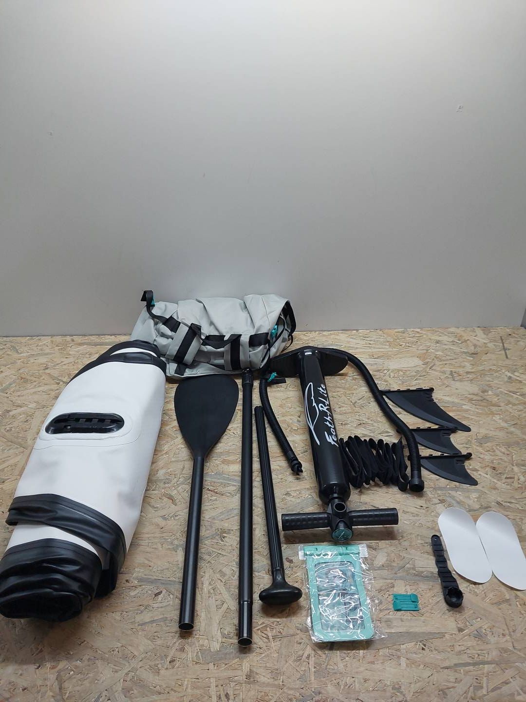 SUP FEAT-R-LITE POSIADA NIEWIELKIE PRZYTARCIA. PRODUKT WYPOSAŻONY JEST WE WSZYSTKIE NIEZBĘDNE AKCESORIA, JEDNAK BRAKUJE JEDNEGO ZABEZPIECZENIA DO PŁETWY ORAZ ZRYWKI.