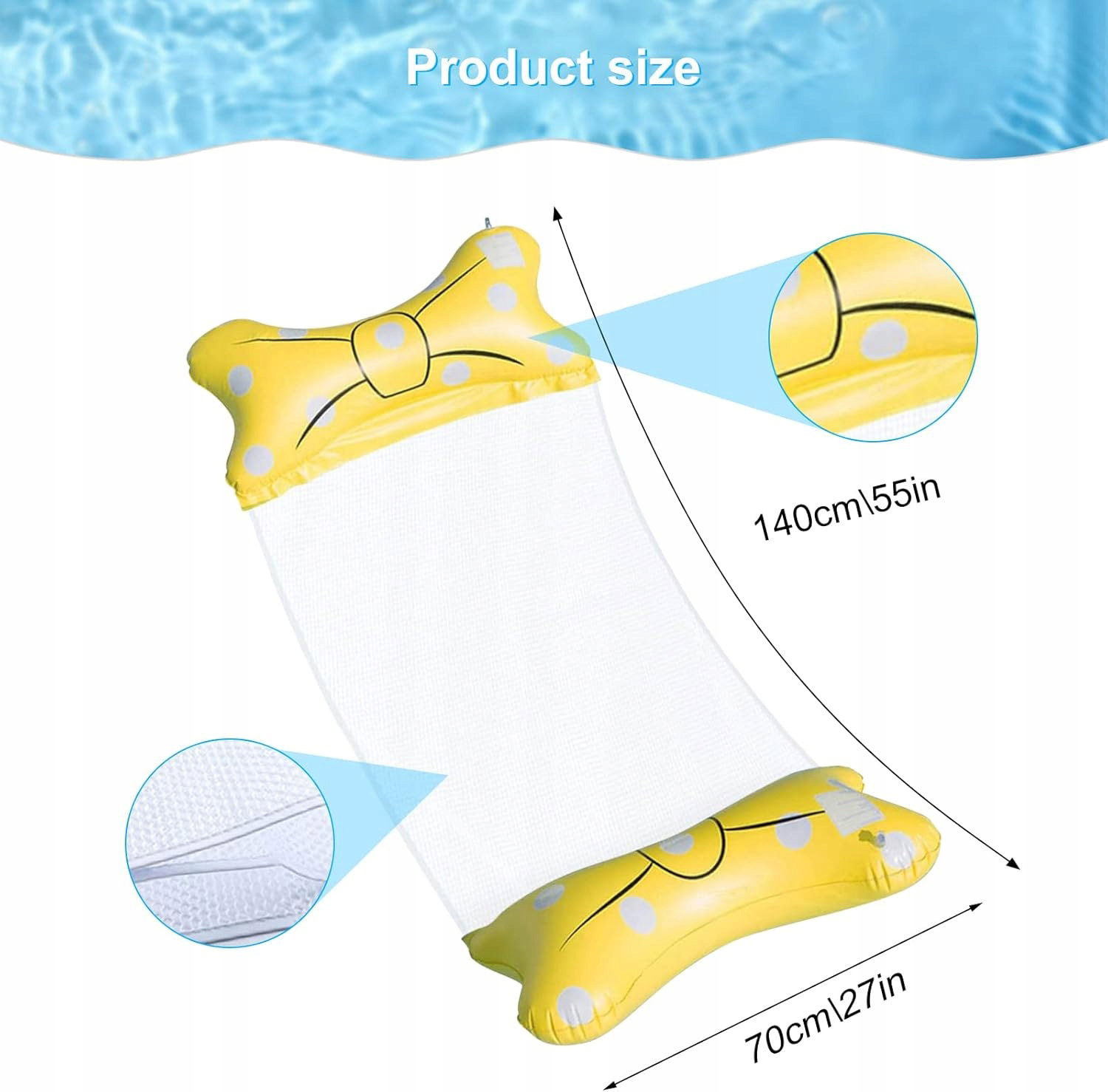 - Materiał PCW i nylon: Wykonany z trwałego PCW i nylonowej siatki, ten hamak jest niezwykle miękki, wygodny i odporny na zużycie. Dodatkowe nadmuchiwane poduszki zapewniają równomierną wyporność i wsparcie.
