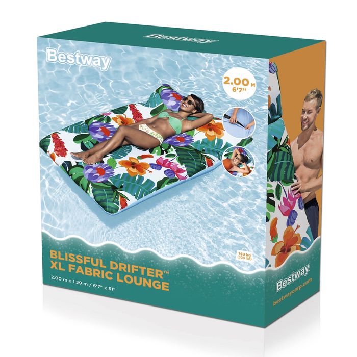Nadmuchiwany gumowo-tekstylny materac BESTWAY Blissful Drifter XL 200 x 129 cm z dwiema nadmuchiwanymi komorami i maksymalnym możliwym obciążeniem do 100 kg. Materac ma zdejmowany i zmywalny pokrowiec tekstylny. Specyfikacja: wymiary materaca: 200 x 129 cm zdejmowany i zmywalny pokrowiec tekstylny materiał z ochroną UV dla lepszej odporności kolorów 2 komory powietrza maksymalne obciążenie do 140 kg w opakowaniu: materac, pokrowiec tekstylny, łatka do naprawy ewentualnych uszkodzeń waga z opakowaniem: 1,5 kg wymiary opakowania: 30 x 35 x 11 cm