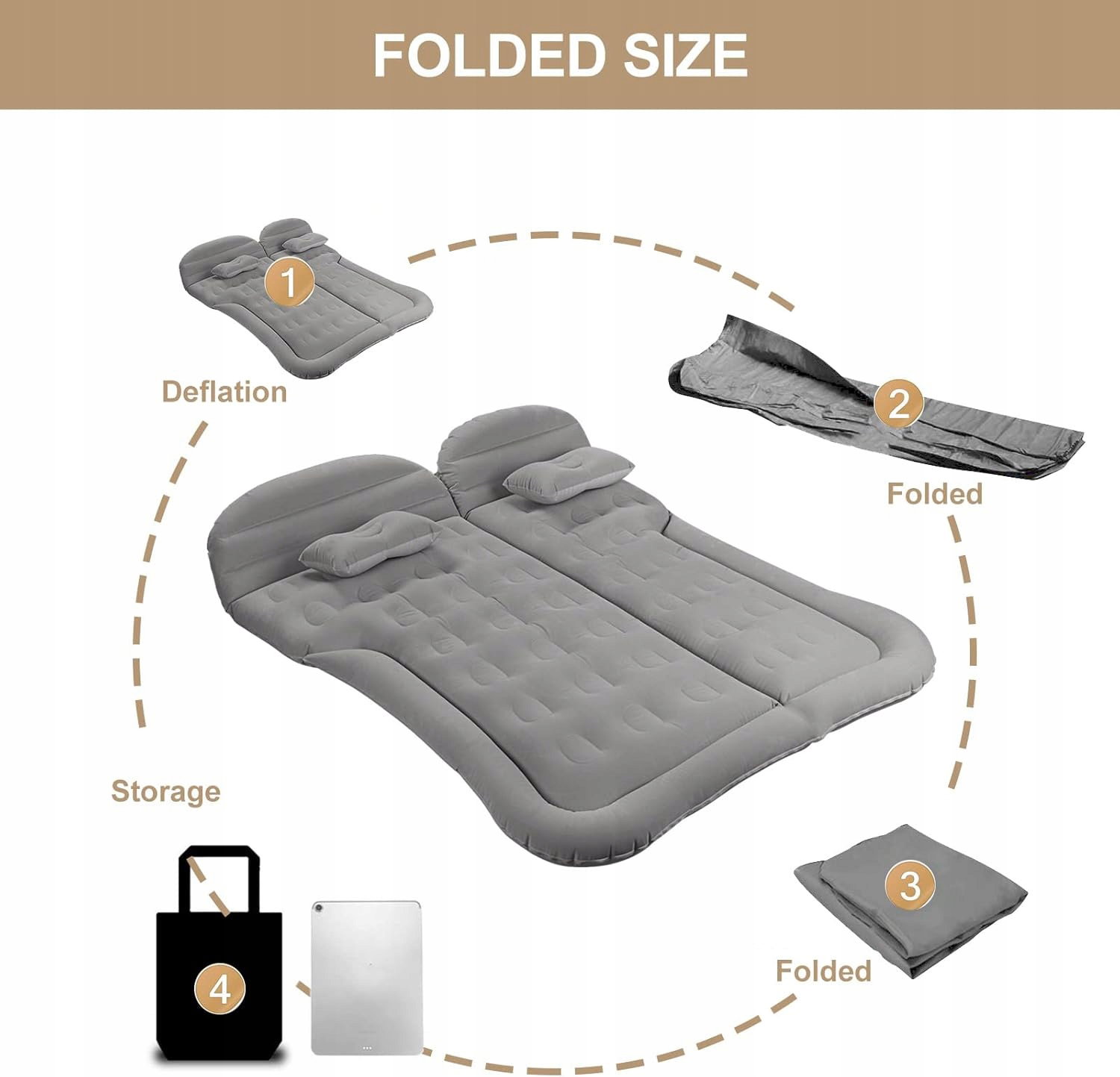 - Wygodna i oszczędzająca miejsce: w zestawie znajduje się pompka samochodowa, dzięki której materac dmuchany można szybko napełnić powietrzem, co pozwala zaoszczędzić sporo czasu. Jeśli nie jest potrzebna, wystarczy wypuścić powietrze przez otwory wentylacyjne, matę można złożyć i schować w torbie, dzięki czemu jest bardzo łatwa w transporcie i zajmuje mało miejsca, idealna na wędrówki z przyjaciółmi