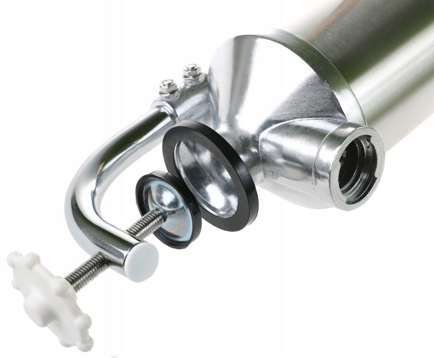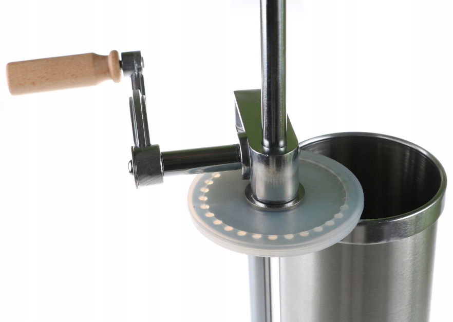 Wykazuje właściwości antybakteryjne, dzięki temu podczas pracy nie wchodzi w reakcję z żywnością. Lekkość i łatwa obsługa gwarantuje sprawne oraz bezpieczne nadziewanie. Dodatkowo praktyczność nadziewarki zwiększa silikonowy uszczelniacz tarczy docisku.