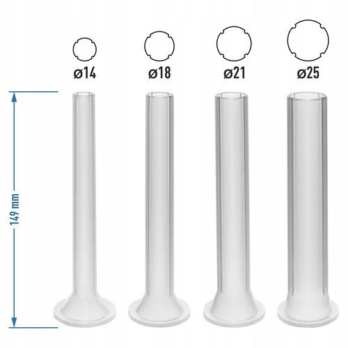 - 4 lejki (z systemem odpowietrzania) w różnych rozmiarach: 14, 18, 21, 25 mm,