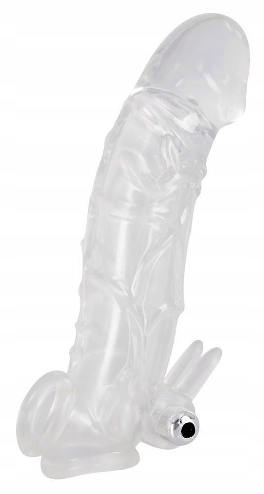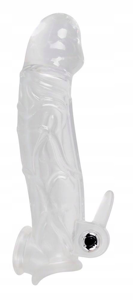 Przezroczysta tuleja na penisa Tuleja na penisa z przedłużeniem i wibracją Crystal Clear z masywną żołędzią i efektownymi żyłkami, które pogrubiają i wydłużają penisa o 5 cm. Zintegrowana osłona na jądra zapewnia bezpieczne dopasowanie i przyjemne uczucie chwytania. Ze zwijaczem łechtaczki i wyjmowaną wibrobulletką. Baterie w zestawie.