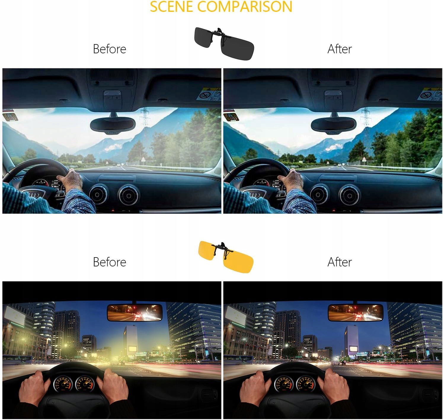 Soczewka najwyższej jakości: wykonana z niezwykle mocnego i trwałego poliwęglanu, zgodna z BS EN 1836: 2005 + A1 2007 i EN ISO 12312-1: 2013. Skutecznie zapobiegają oślepianiu. W ciągu dnia możesz użyć czerni, a w nocy żółtego, aby uzyskać pożądany efekt.