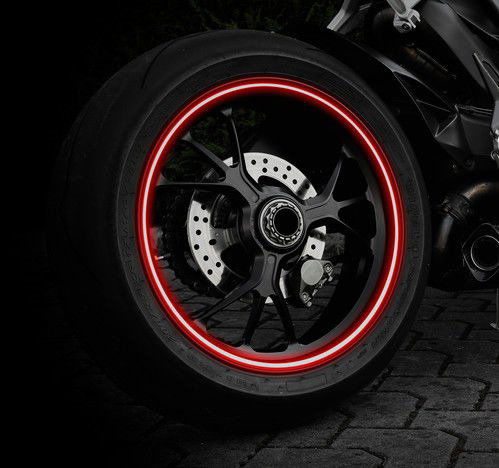 Naklejki na obręcze - odblaskowe kolory metaliczne, dzięki którym motocykl jest lepiej widoczny w świetle dziennym i po zmroku.
