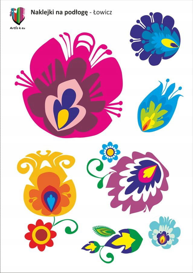 Zestaw naklejek ze wzorem łowickim na podłogę. Na jednym arkuszu znajduje się 7 elementów kwiatów łowickich. Nadruk na grubej folii odpornej na ścieranie, stosowany wewnątrz pomieszczeń. Naklejać na suchą, gładką i oczyszczoną powierzchnię. Produkt Polski.