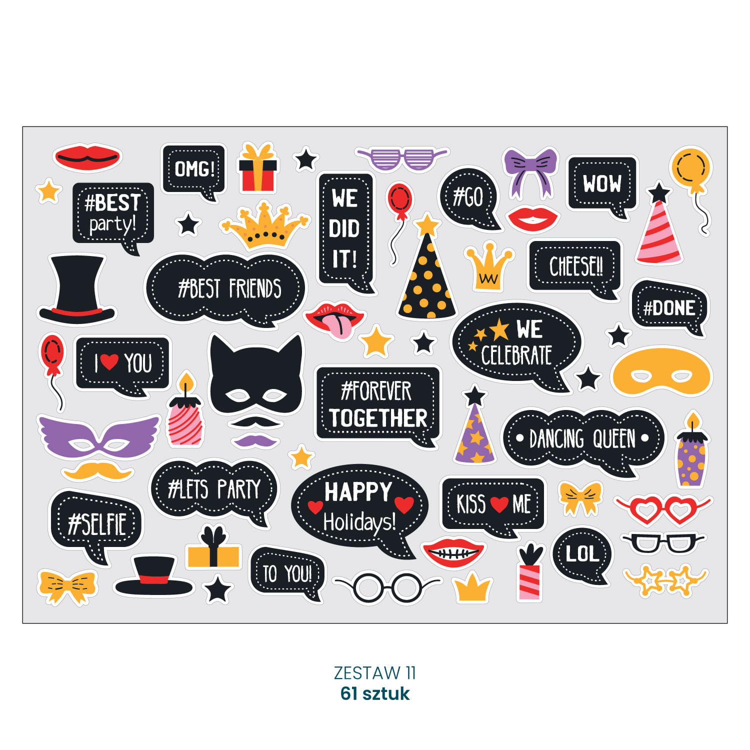 W zestawie 11 znajduje się 1 arkusz o wymiarze 210x148mm na którym mieści się 61 szt. naklejek