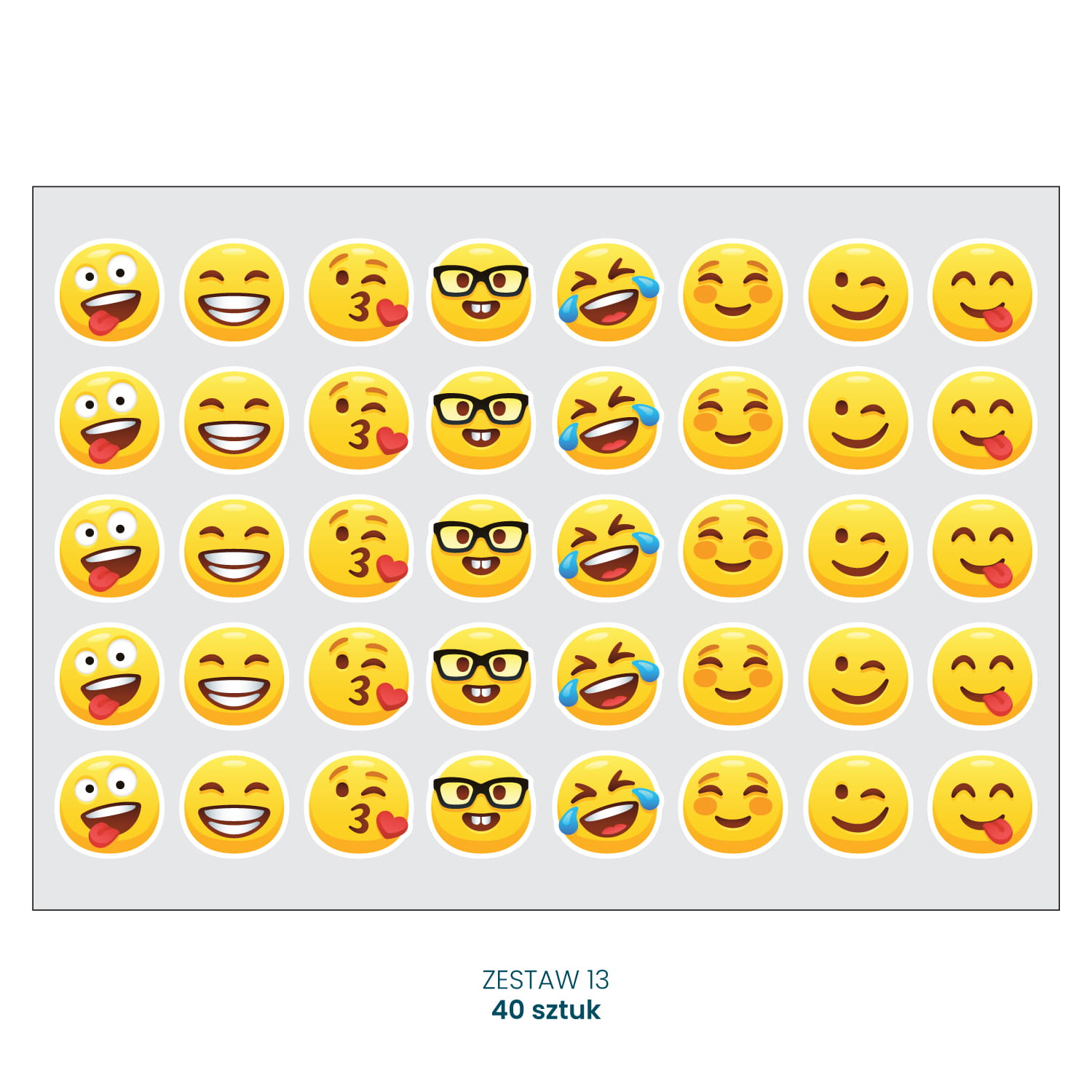 W zestawie 13 znajduje się 1 arkusz o wymiarze 210x148mm na którym mieści się 40 szt naklejek