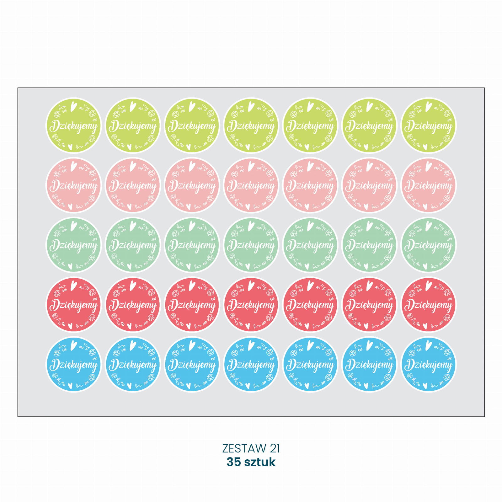 W zestawie 21 znajduje się 1 arkusz o wymiarze 210x148mm na którym mieści się 35 szt. naklejek