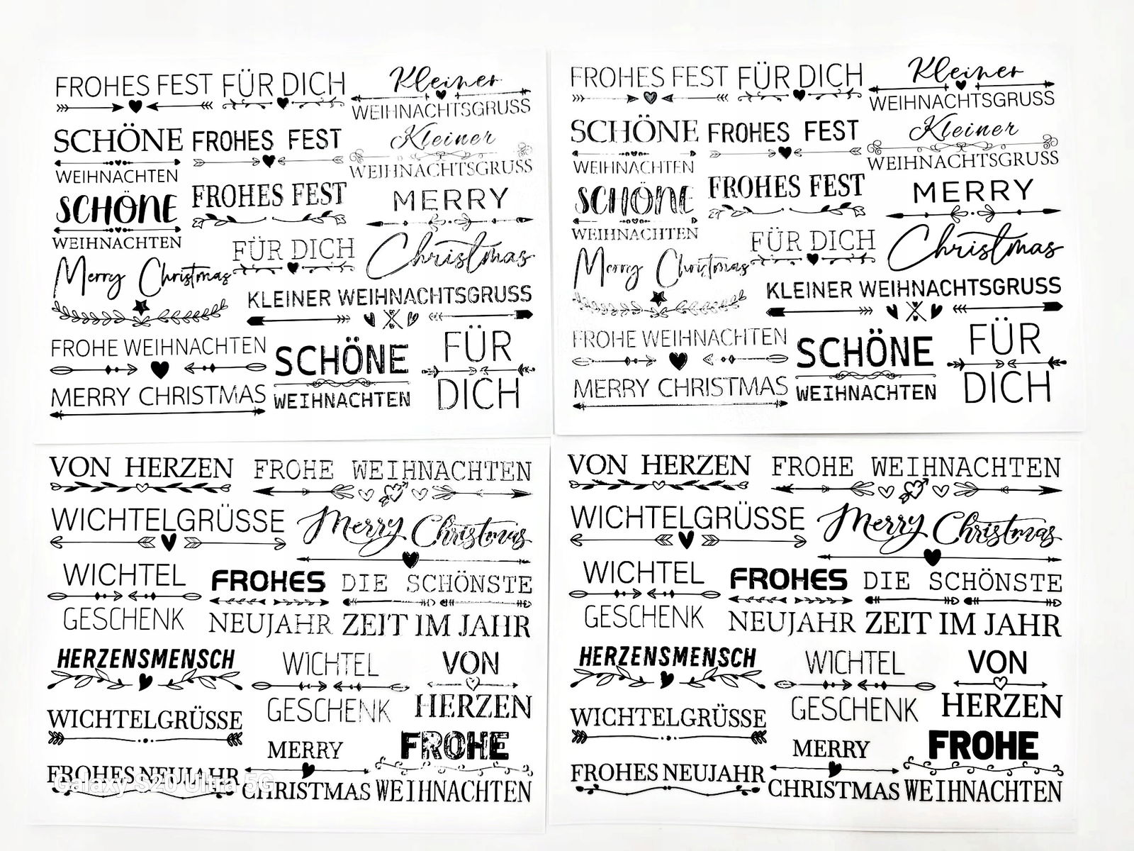 Zestaw 4 arkuszy naklejek rub-on o wymiarach 15 × 19 cm to około 50 świątecznych napisów, które możesz wykorzystać w dekoracjach z Raysinu, Keraflott i wielu innych projektach DIY.