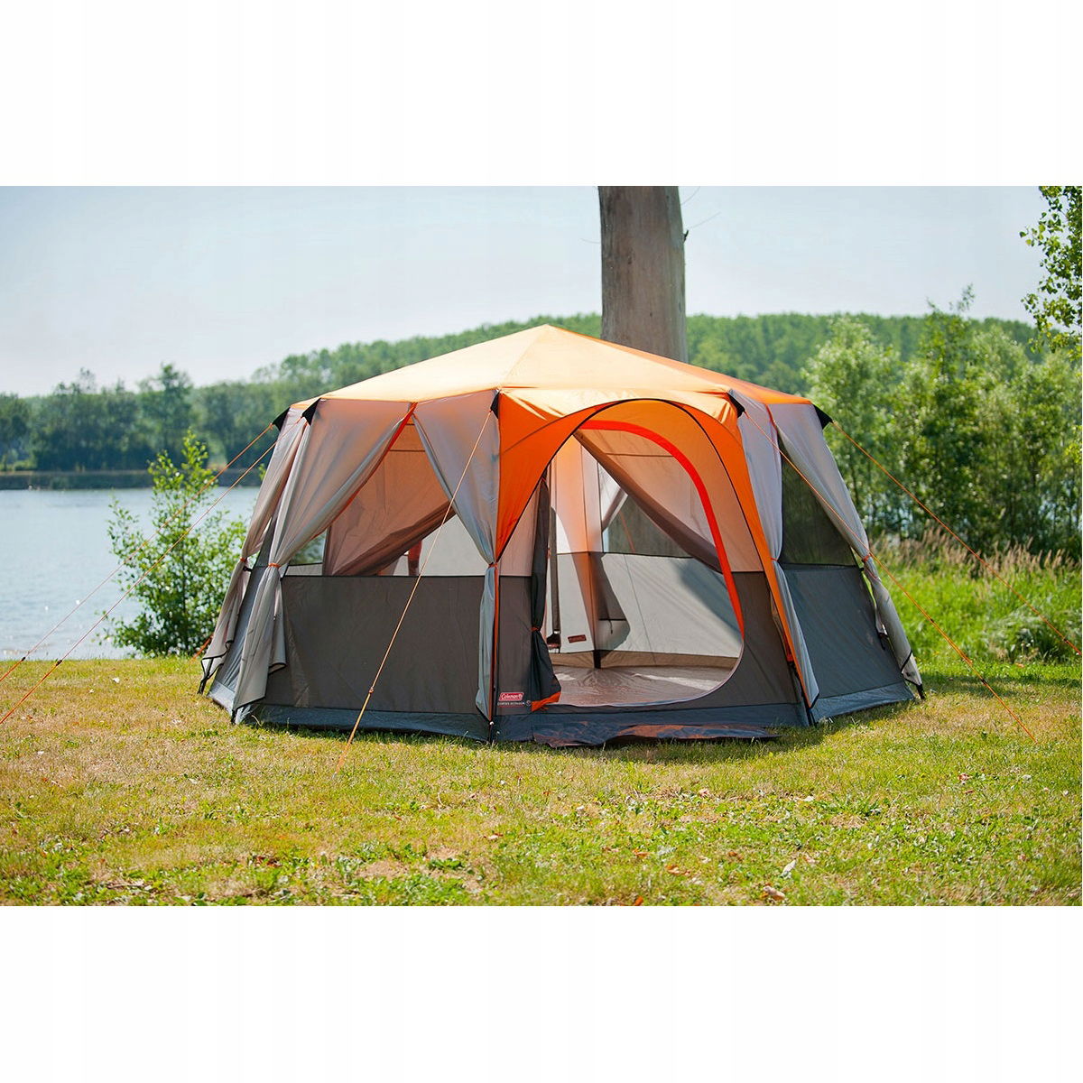 Turystyczny namiot rodzinny Coleman Cortes Octagon 8. Wyposażony został w opatentowane drzwi na zawiasy, okna/otwory wentylacyjne, gwarantujące widok 360 stopni, a także technologie UV Guard (ochrona przed szkodliwym promieniowaniem słonecznym) i Fire retardant (zapobiega rozprzestrzenianiu się ognia).