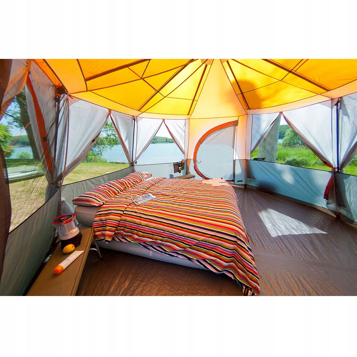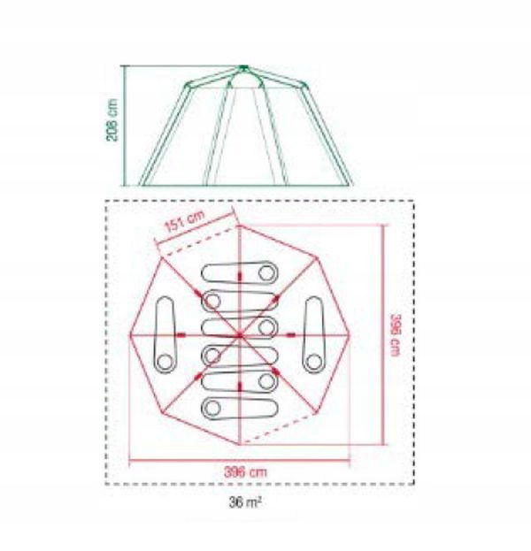 widok - 360 stopni (okna/otwory wentylacyjne) przemyślany system otworów wentylacyjnych mocna podłoga z polietylenu (100 % wodoodporności) lekki poliesterowy tropik (wodoodporna powłoka PU) wodoodporność tropiku na poziomie 2000 mm H2O klejone szwy technologia UV Guard (ochrona przed szkodliwym promieniowaniem) system antypożarowy Fire Retardant namiot wewnętrzny z siateczki Zestaw zawiera torbę na kółkach.