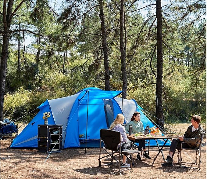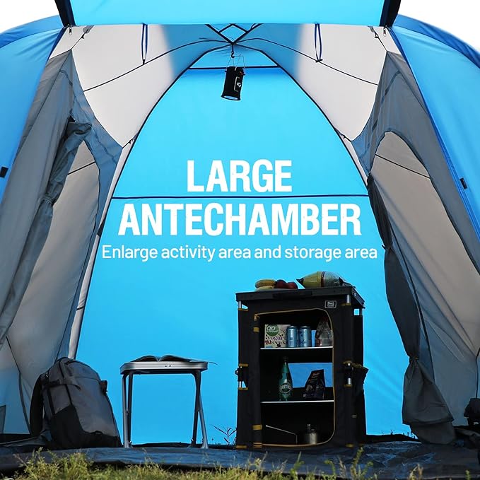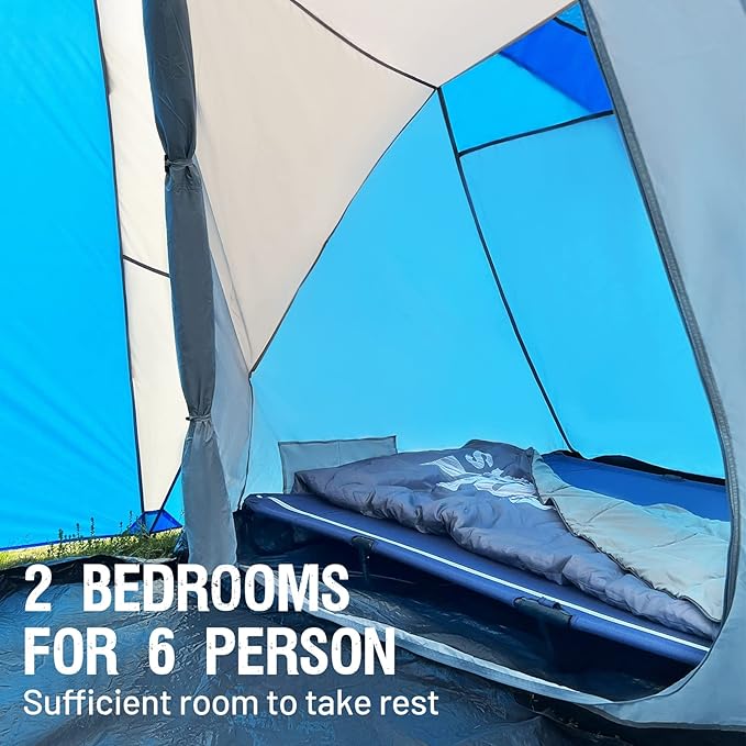 Przestronny projekt: 2 sypialnie z oknem - blokują światło słoneczne i wiatr, aby zapewnić komfortowy sen. Namiot rodzinny z częścią dzienną - z oddzielną podłogą, idealny dla grupy/rodziny/przyjaciół razem. Osłona przeciwsłoneczna - może być otwarta, aby zapobiec nasłonecznieniu lub złożona, gdy nie jest używana.