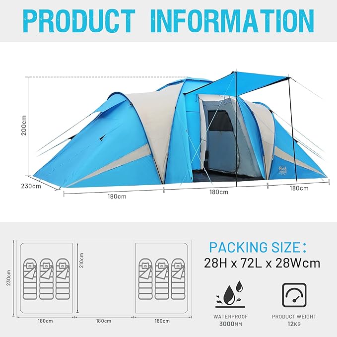 Łatwa instalacja: Zapewniamy wszystko, co potrzebne do ustawienia rodzinnego namiotu tunelowego, pakiet zawiera - cztery główne słupy nośne (odpowiadające kolorowi otworu namiotu), dwa słupy przeciwsłoneczne, gwoździe, dwie sypialnie (typu zintegrowanego, z matami podłogowymi i drzwiami) oraz matę podłogową w salonie (z podniesionymi bokami - aby zapobiec przedostawaniu się wody).