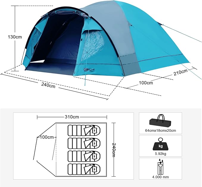 ⋆ Wymiary: nasz namiot kempingowy dla 4 osób zapewnia przestronną przestrzeń do spania o powierzchni 5 , w której mogą się pomieścić 3–4 osoby. Ma on wymiary 210 x 240 x 130 cm (szer. x dł. x wys.). Mały przedsionek ma wymiary 2,4 (100 x 240 cm). Wymiary po złożeniu to 64 x 20 x 18 cm.⋆ Jest wyposażony w drzwi z siatki: do namiotu dodajemy drzwi do sypialni z siatki, które chronią przed owadami. Mam nadzieję, że ten ulepszony model za