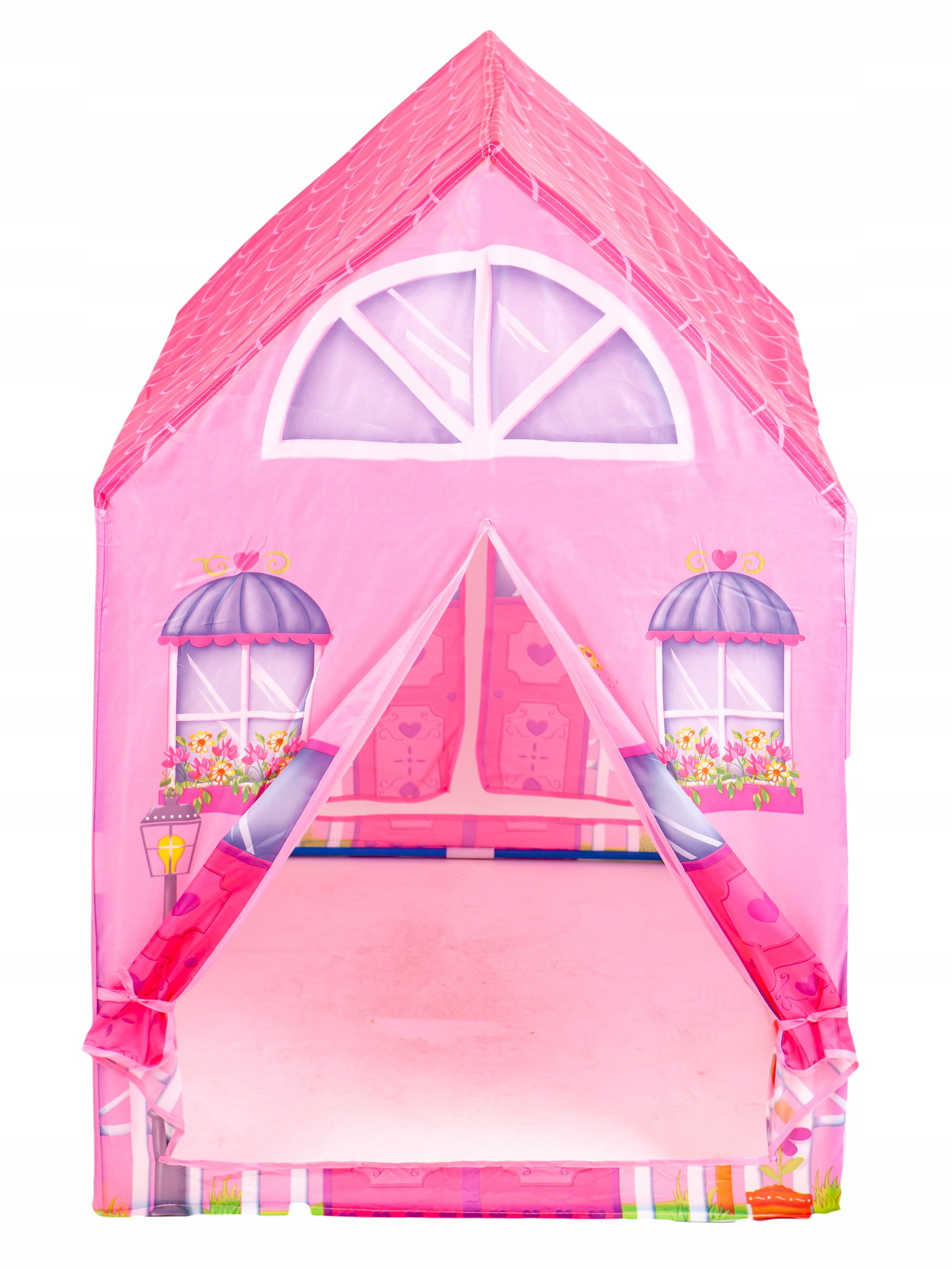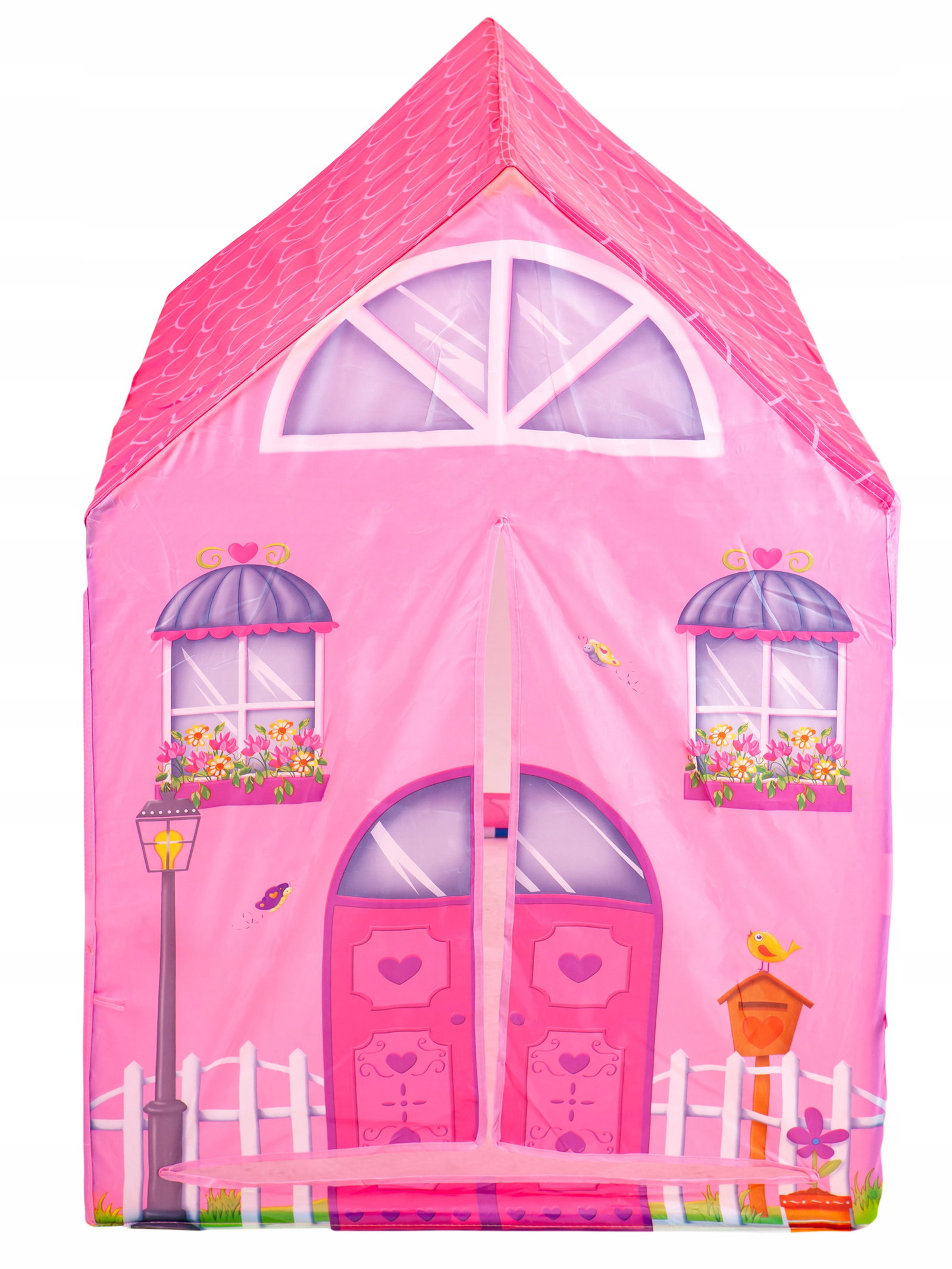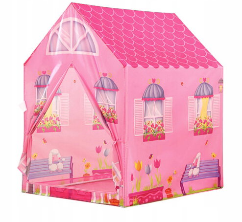 Produkt kształtem przypomina różowy domek - posiada daszek. Jego charakter idealnie wpasuję się w klimat dziewczęcego pokoju i będzie sprawiał frajdę przy wielu zabawach z koleżankami. Namiot jest praktyczny oraz łatwy w montażu. Dzięki lekkiemu stelażowi łatwo przenieść go z miejsca na miejsce.