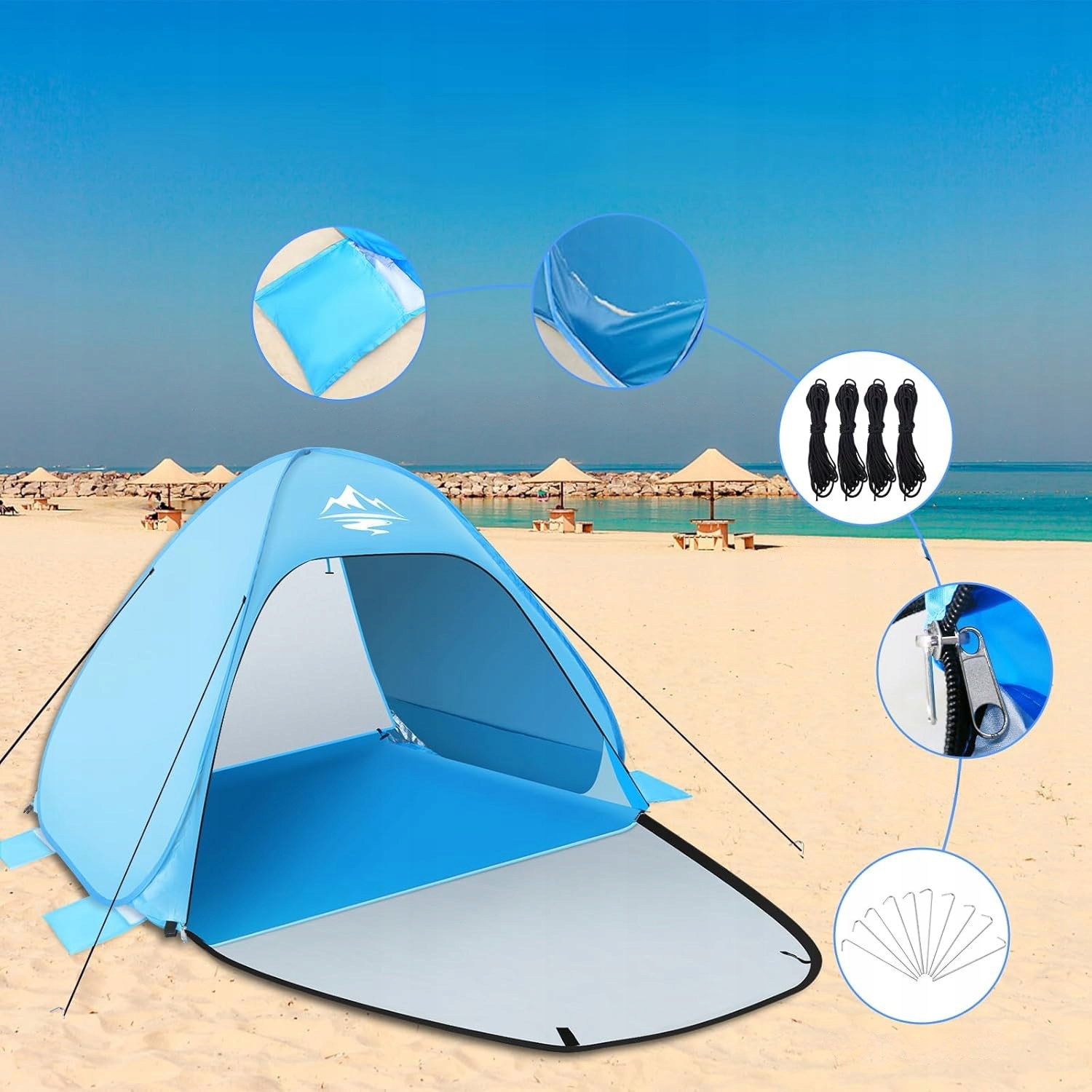 - Ochrona i stabilność: powłoka UPF 50+ skutecznie ogranicza działanie promieni słonecznych, zapewniając bezpieczną przestrzeń dla dzieci i dorosłych. Konstrukcja wyposażona w 10 stalowych śledzi oraz 4 linki przeciwwiatrowe zwiększa stabilność nawet przy silniejszym wietrze. Wzmocnione szwy oraz podwójne zamki błyskawiczne poprawiają trwałość podczas intensywnego użytkowania.