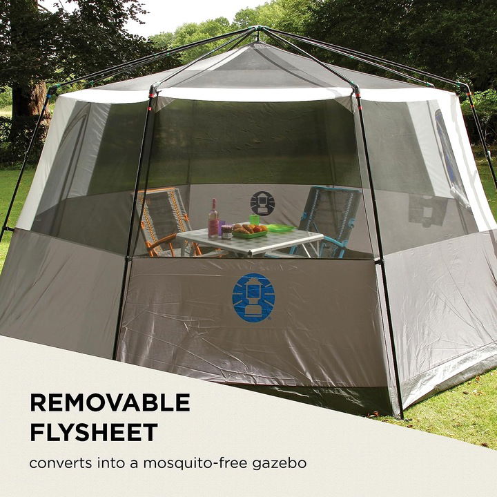 System Coleman® Easy set up gwarantuje prostotę składania i rozkładania namiotu. Namiot rozstawia się łatwo i szybko. Namiot posiada dwa wejścia w kształcie litery D. Mocowane one są na zawiasach, co umożliwia pozostawienie ich w pozycji otwartej. Duże okna rozmieszczone na wszystkich ściankach nie tylko zapewniają widoki, ale również gwarantują efektywność wymiany powietrza i ciągłą cyrkulację.
