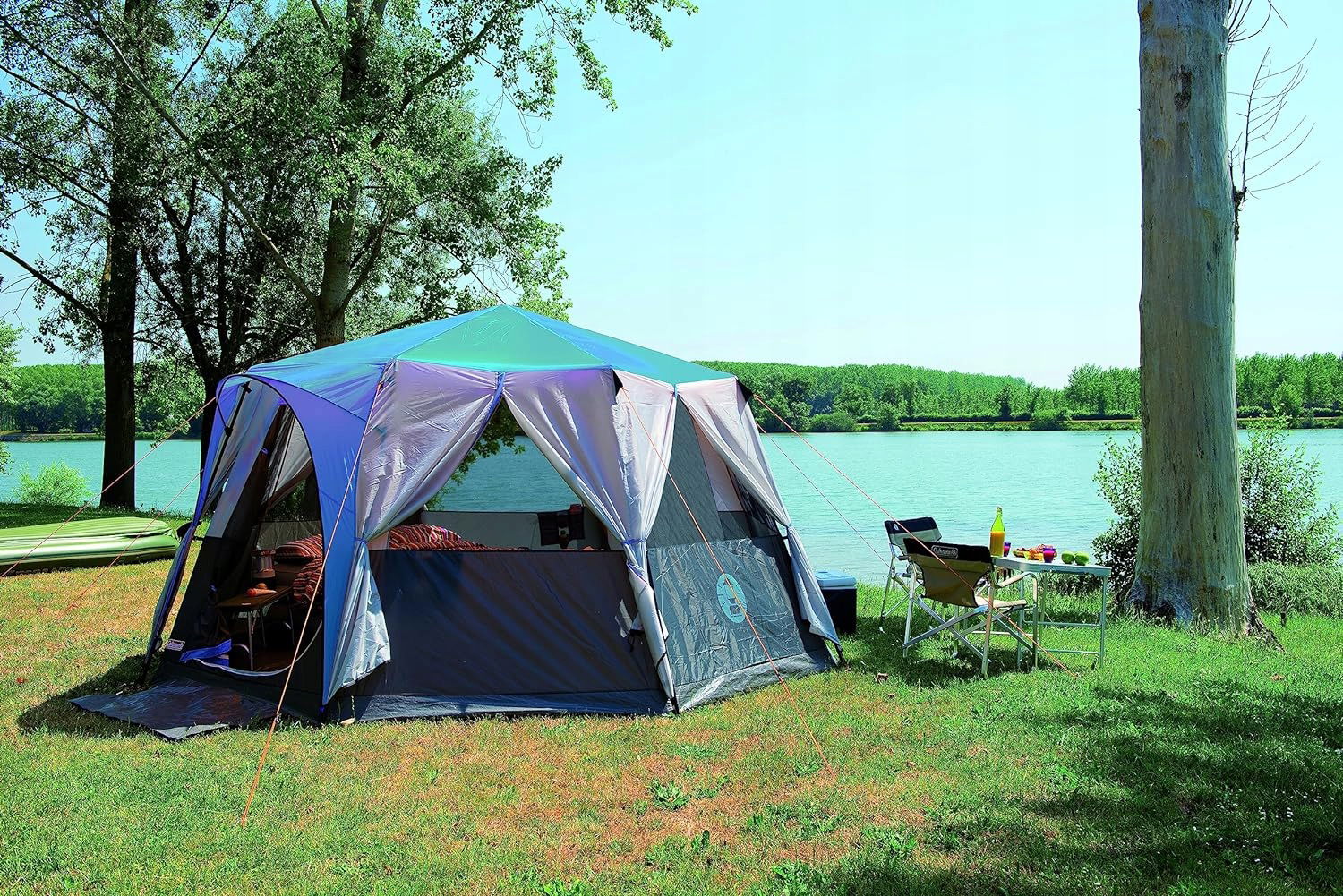 Duży, przestronny namiot o ośmiokątnej budowie, zapewnia komfortowe warunki do odpoczynku, nawet dla ośmiu osób, doskonale chroni przed deszczem i wiatrem.
