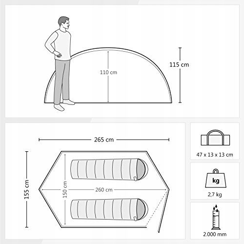 Wymiary po złożeniu 47 x 13 x 13cm / waga 2,7kg / słup wody 2000mm (wodoodporny) / stabilny namiot 1-2-osobowy.