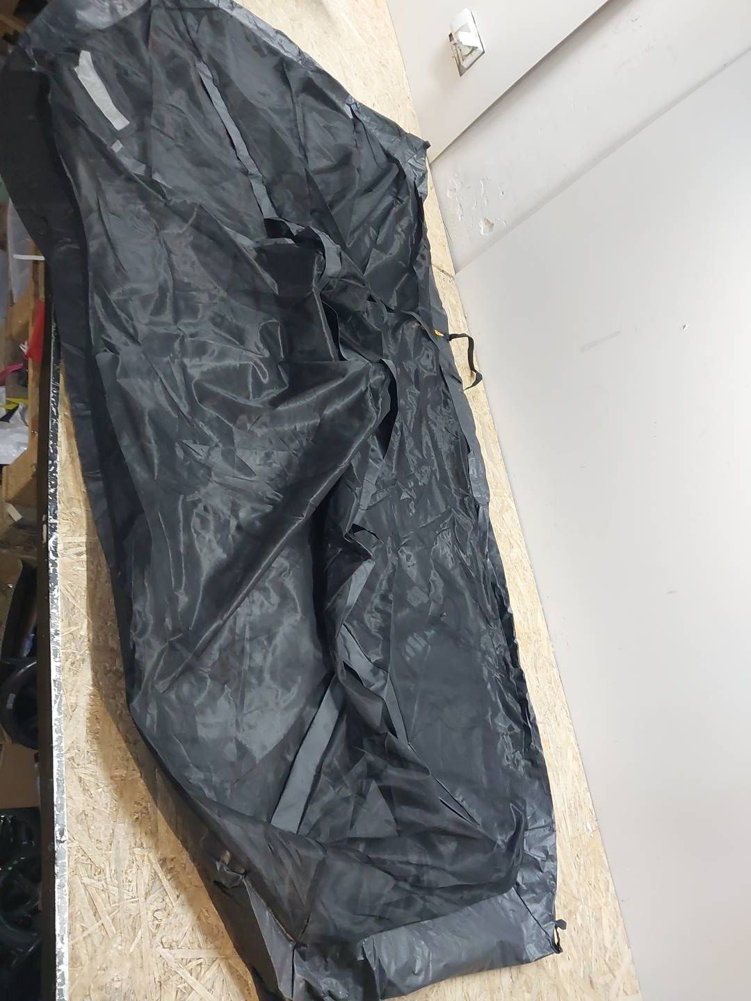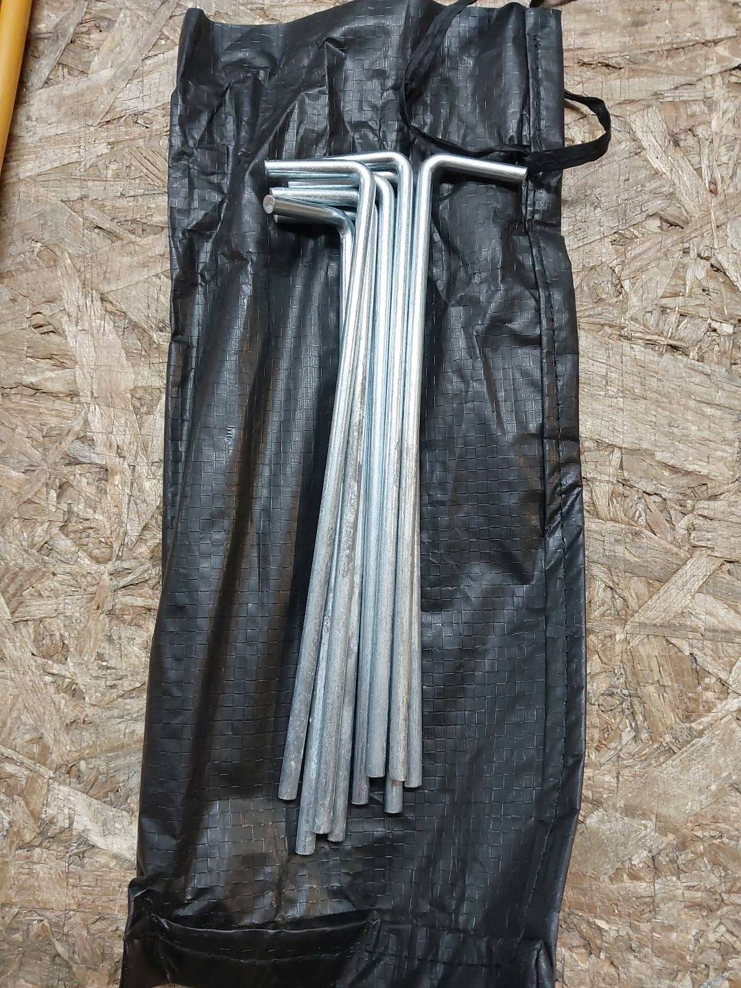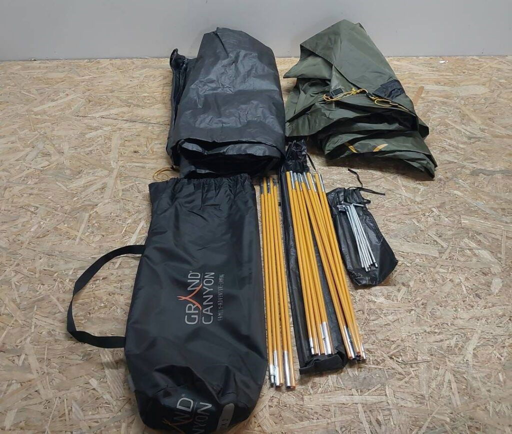 NAMIOT LEKKO PRZYBRUDZONY W WYNIKU EKSPOZYCJI. W ZESTAWIE: 9 ŚLEDZI, KOMPLET SZNURKÓW PRZYPIĘTYCH DO NAMIOTU ORAZ 3 PAŁĄKI. GOTOWY DO UŻYTKU.