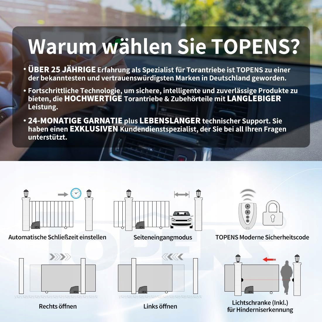 Wielopoziomowa ochrona: Dzięki zaawansowanej technologii TOPENS Code pilot zdalnego sterowania doskonale zapobiega nieautoryzowanemu dostępowi. Dzięki dołączonej fotokomórce TC102 brama cofa się podczas zamykania, gdy natrafi na przeszkodę. Dodatkowe bezpieczeństwo zapewnia lampka alarmowa 230 VAC (w zestawie). Z ręcznym kluczem zwalniającym w przypadku zaniku zasilania lub zgubienia pilota.