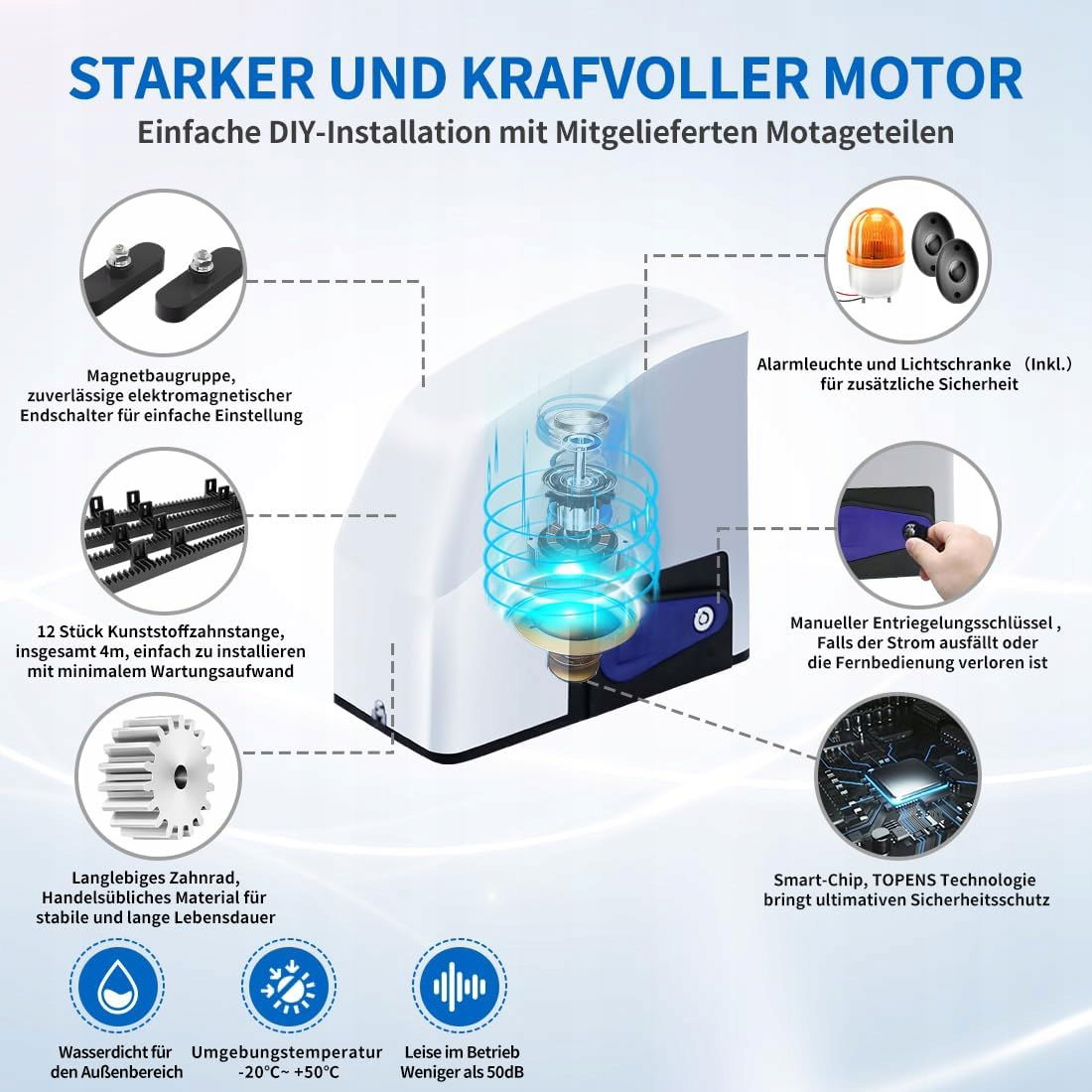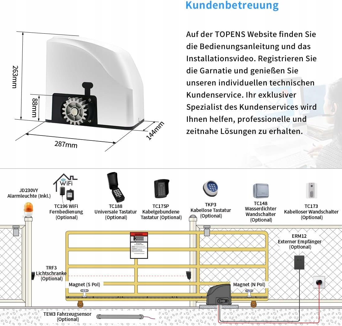 TOPENS RK500T Automatyczny otwieracz bramy przesuwnej do maks. 600 kg i 12 m z 2 pilotami, zębatką 4 m, światłem alarmowym, barierą świetlną do bramy podwórkowej