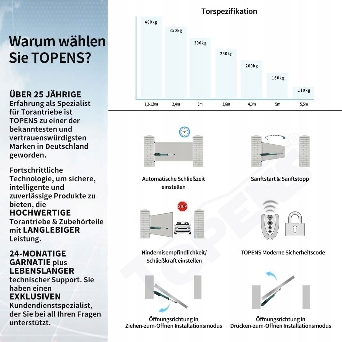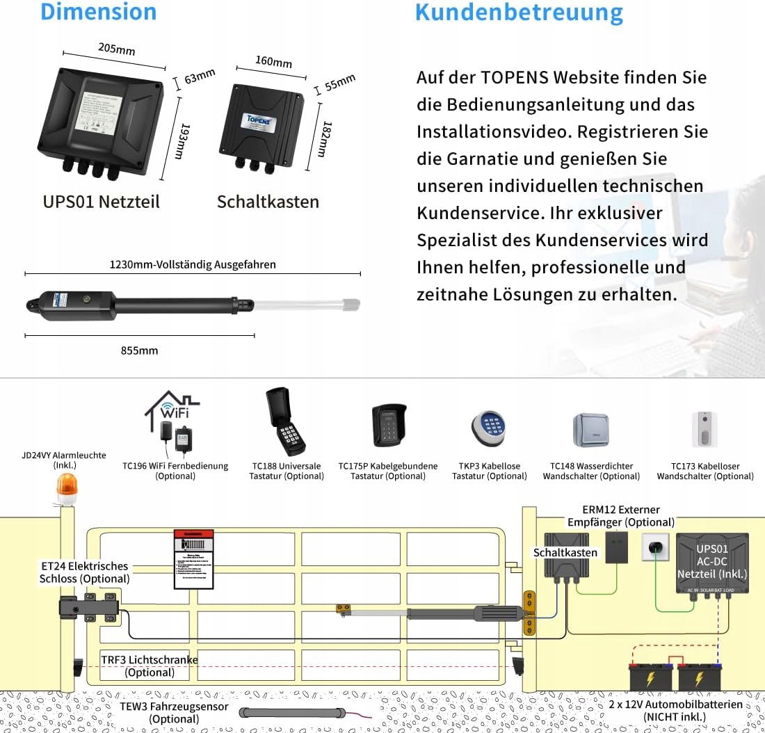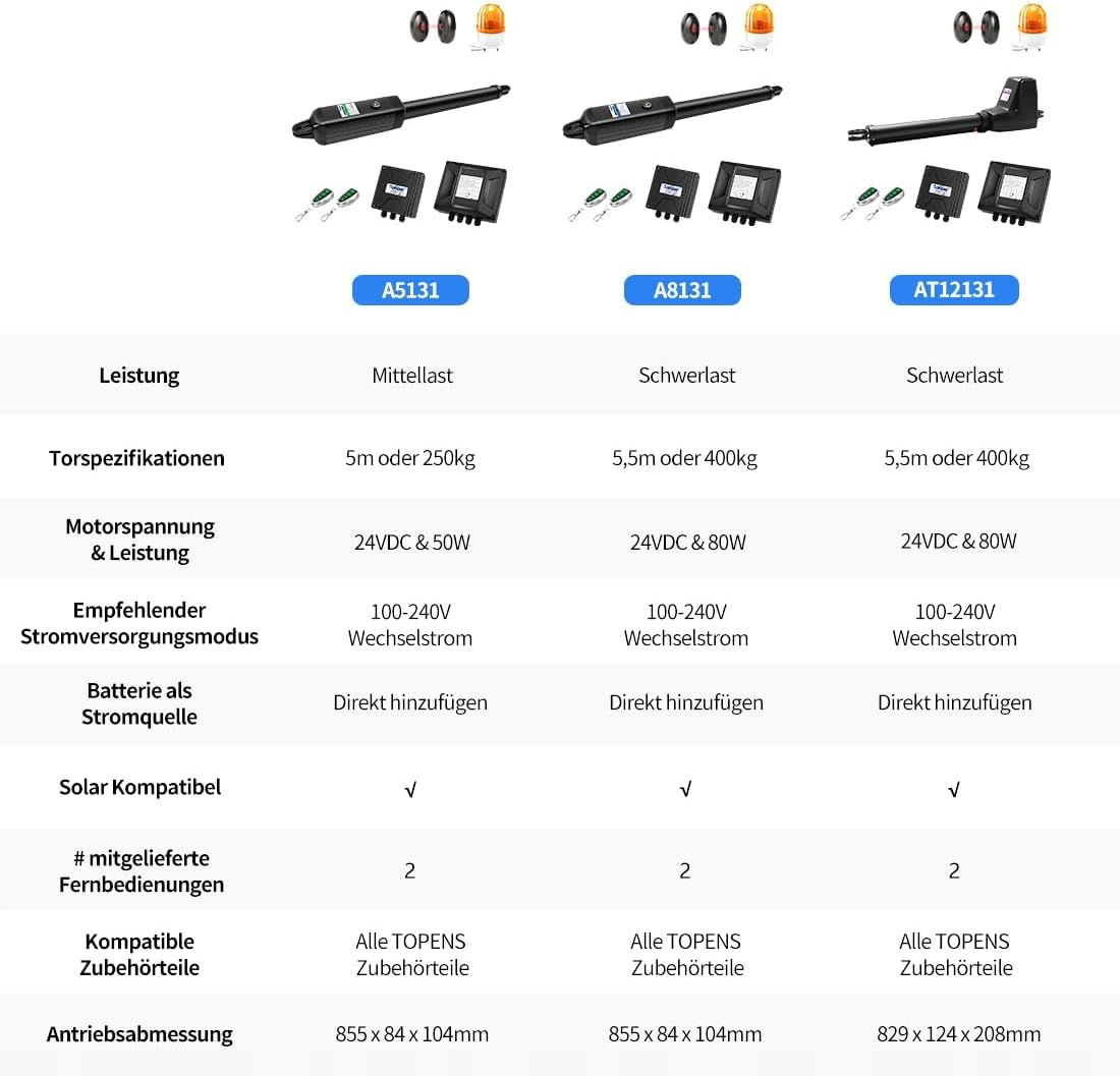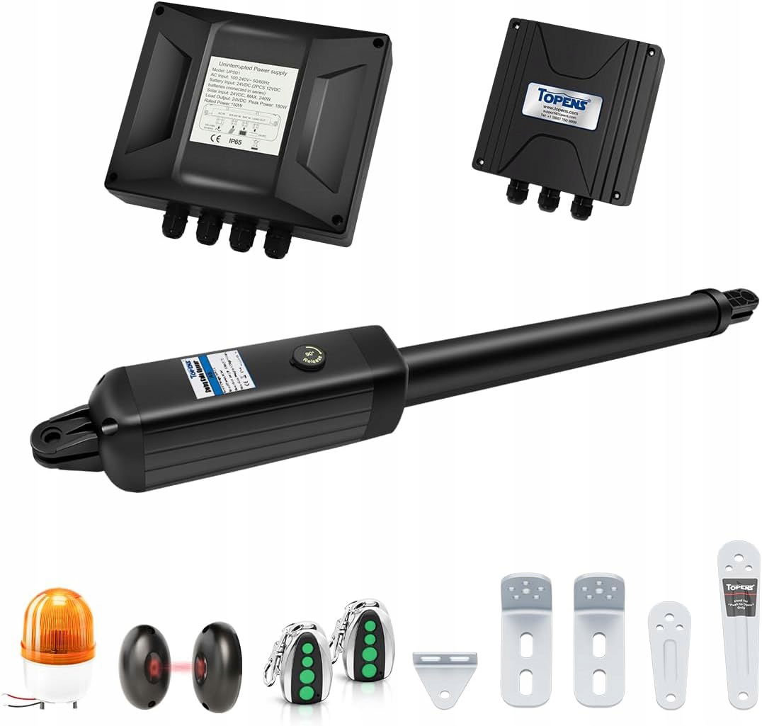 Napęd do bram skrzydłowych TOPENS A8131, automatyczny, o dużej wytrzymałości, otwieracz bram, maks. długość bramy 5,5 m lub waga bramy 400 kg, sterowanie prądem zmiennym, 2 piloty