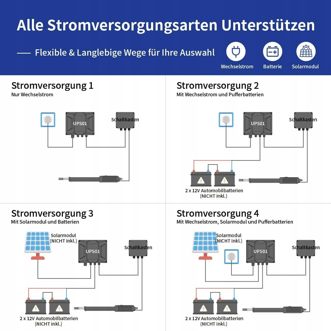 Zasilanie: dostępne są elastyczne tryby zasilania do wyboru. Obsługiwany jest również panel słoneczny o mocy 20 W. Zasilacz UPS01 może zasilać system, ładować akumulator wydajnie i regulować prąd ładowania słonecznego.