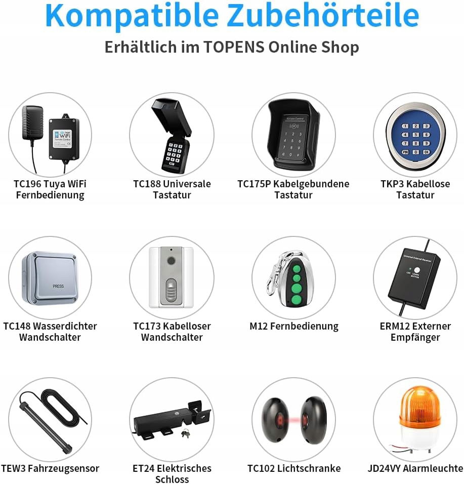 Wielokrotna ochrona: dzięki zaawansowanemu kodowi TOPENS pilot zdalnego sterowania doskonale zapobiega nieautoryzowanemu dostępowi i zapewnia wieloraką ochronę. Niezawodny elektromagnetyczny wyłącznik krańcowy jest łatwy w regulacji. „Automatyczna blokada” zabezpiecza nieruchomość, gdy wychodzisz. „Łagodny start i łagodne zatrzymanie” chronią silnik. Bariera świetlna i światło alarmowe (w zestawie) zapewniają dodatkowe bezpieczeństwo. Klucz ręcznego zwalniania (w zestawie) służy do użytku zapasowego.