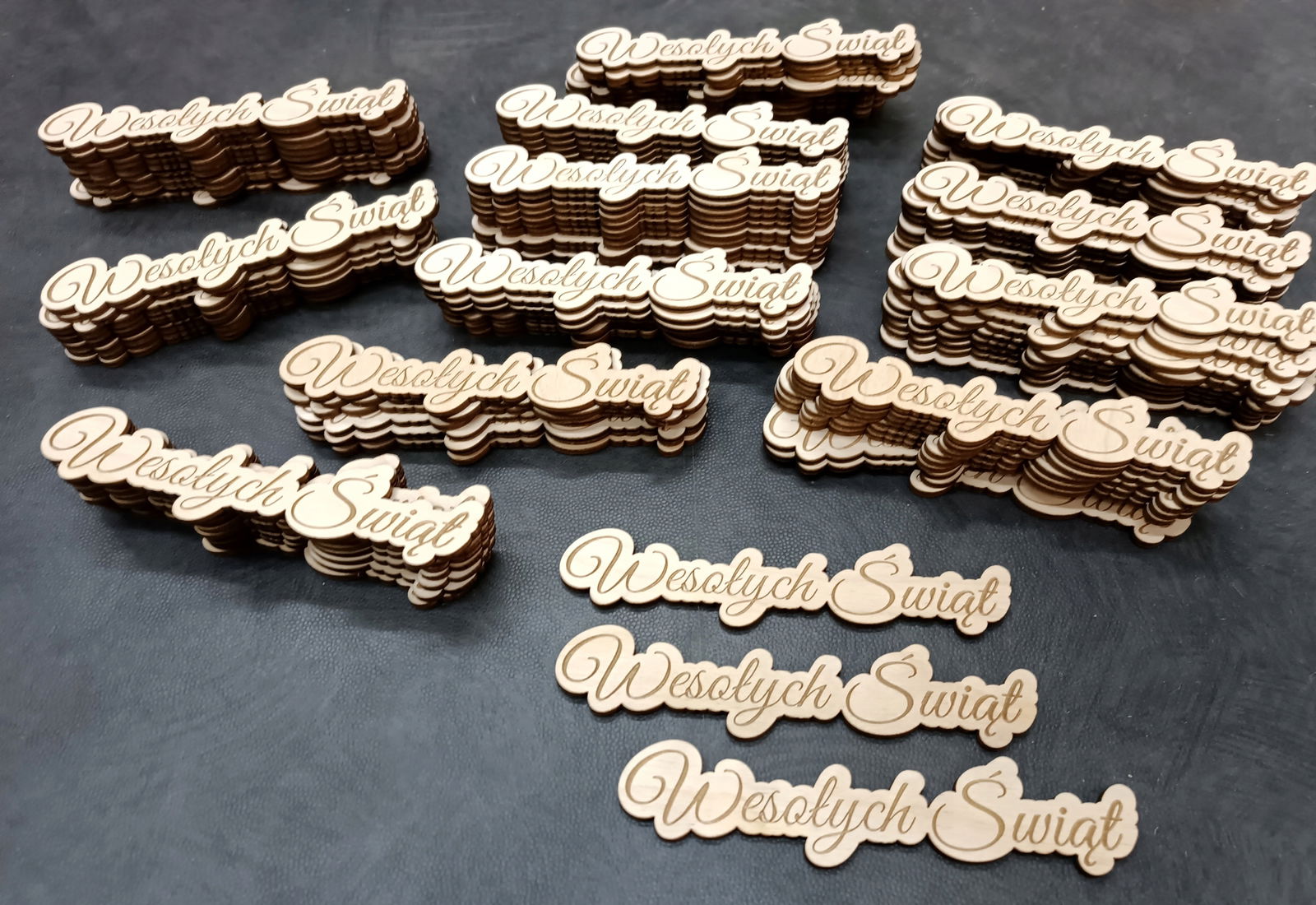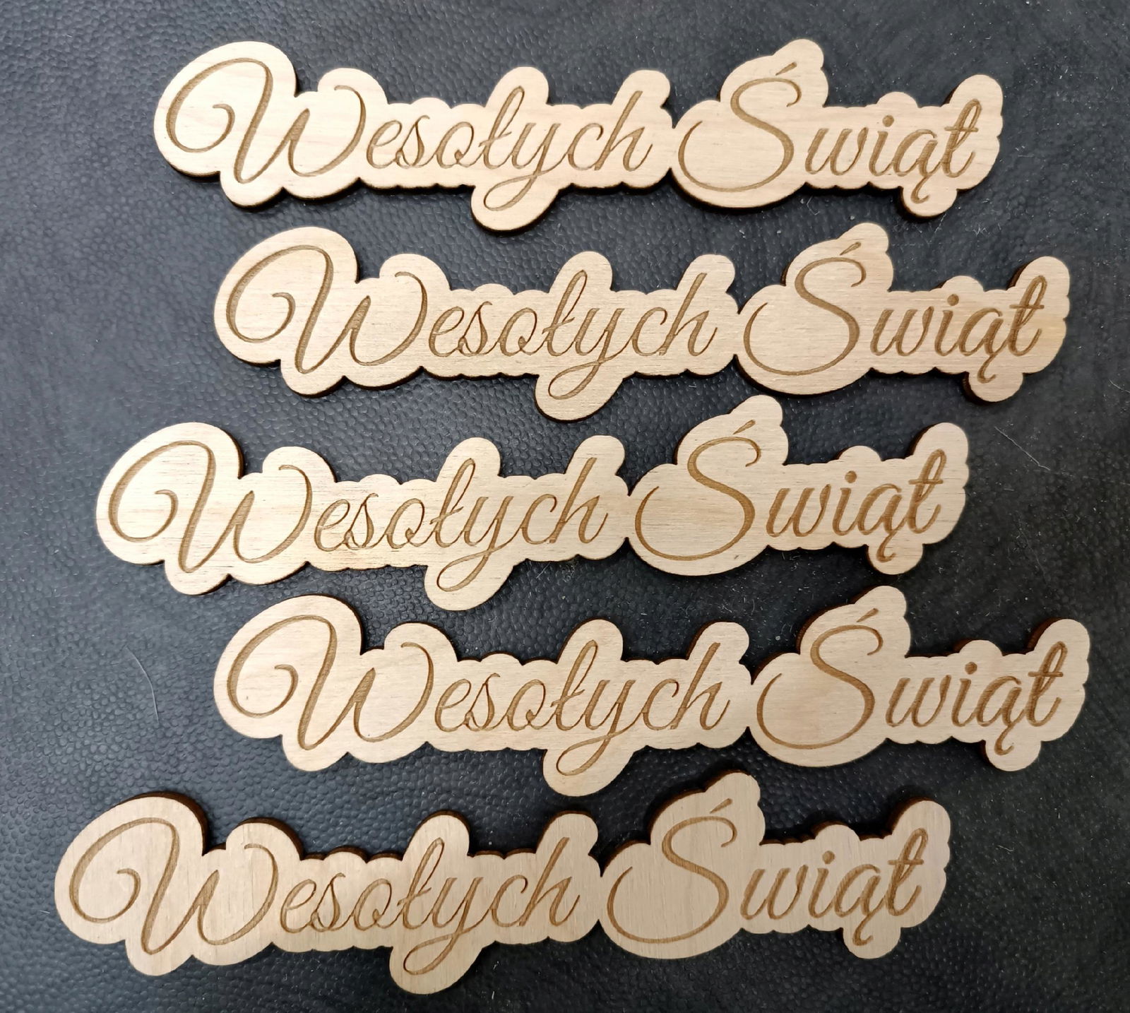 Drewniany napis Wesołych Świąt wykonany jest ze sklejki o grubości 3 mm.