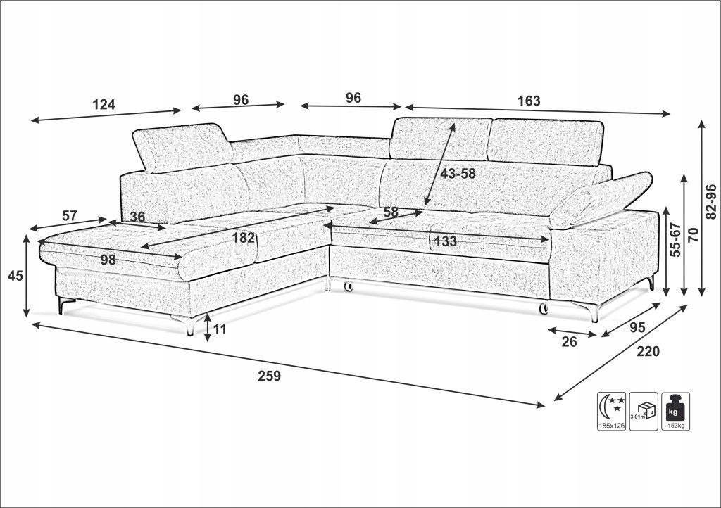 - Funkcja spania: 185cm x 126cm