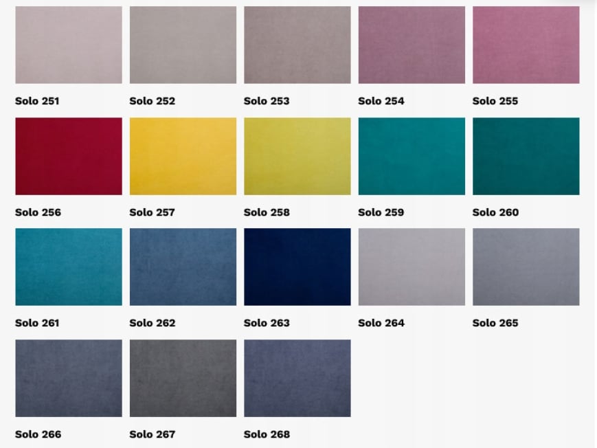 SOLO – tkanina meblowa typu velvet, bardzo przyjemna w dotyku o szlachetnej strukturze. Tkanina tapicerska Solo posiada dodatkową powłokę hydrofobową ułatwiającą czyszczenie. Niezwykle bogata paleta kolorystyczna zapewnia ogromne możliwości aranżacyjne, odpowiednie zarówno dla wnętrz klasycznych jak i nowoczesnych. Jednakowy kolor z obu stron tkaniny. Idealna na meble, elementy dekoracyjne, zasłony i kotary.