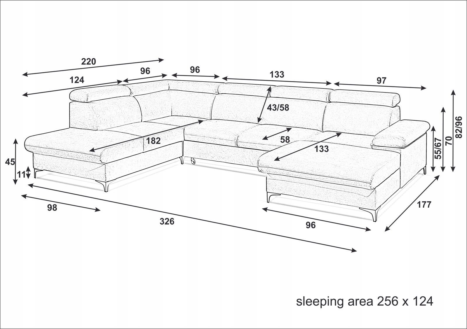 - Funkcja spania: 256cm x 124cm