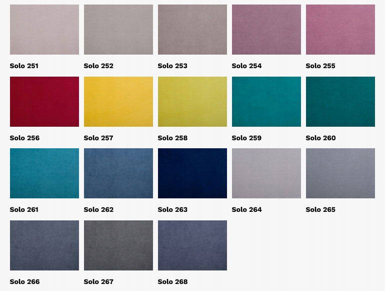 SOLO i Cloud – tkanina meblowa typu velvet, bardzo przyjemna w dotyku o szlachetnej strukturze. Tkanina tapicerska Solo posiada dodatkową powłokę hydrofobową ułatwiającą czyszczenie. Niezwykle bogata paleta kolorystyczna zapewnia ogromne możliwości aranżacyjne, odpowiednie zarówno dla wnętrz klasycznych jak i nowoczesnych. Jednakowy kolor z obu stron tkaniny. Idealna na meble, elementy dekoracyjne, zasłony i kotary.