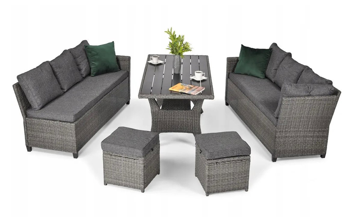 W zestawie: narożnik ogrodowy (lub dwie sofy 3-osobowe), duży stół obiadowy, dwie pufy ogrodowe, poduszki na oparcia i siedzenia.