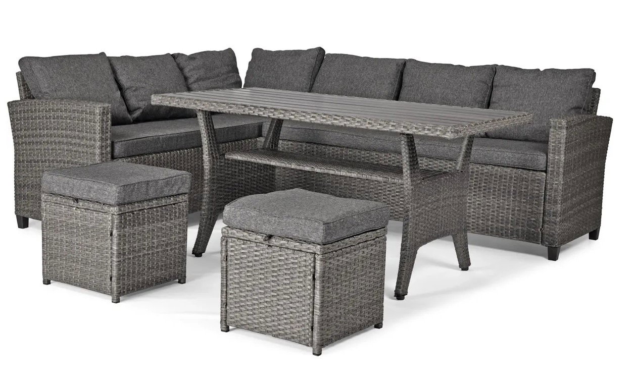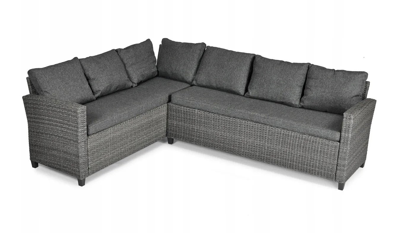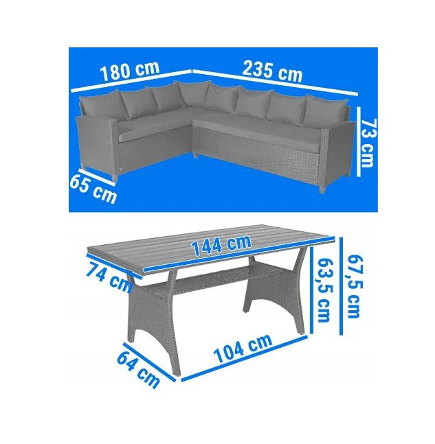 - W zestawie: stół ogrodowy, pufa x 2szt., narożnik (lub kanapa 3-osobowa x 2 szt.), długa poduszka na siedzenie x 2 szt., poduszka na oparcie x 7 szt., poduszka na puf x 2 szt.