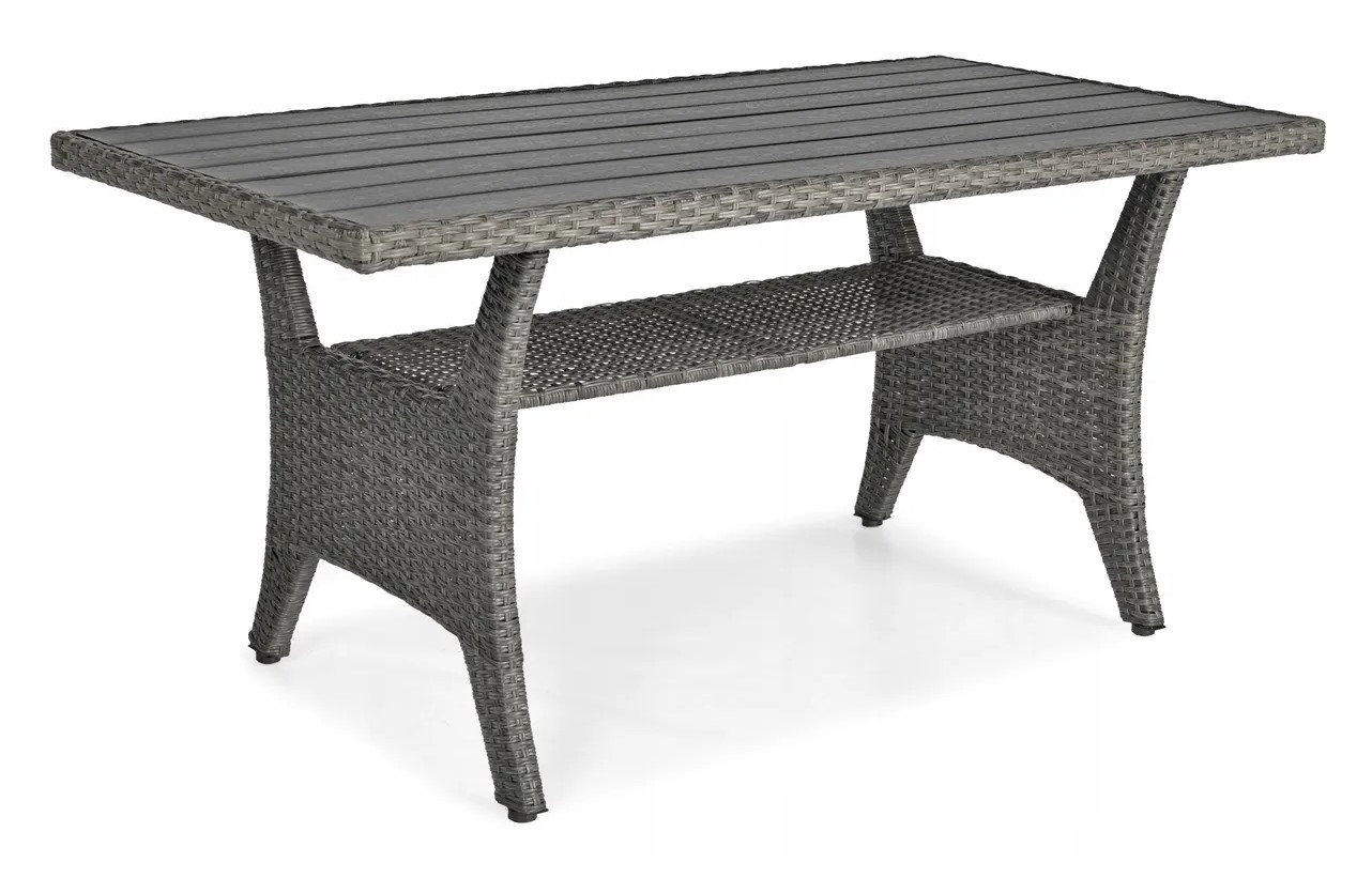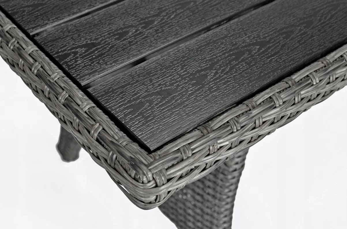 Stół wchodzący w skład zestawu ma blat wykonany z praktycznych i eleganckich desek kompozytowych, które odznaczają się dużą odpornością warunki pogodowe.