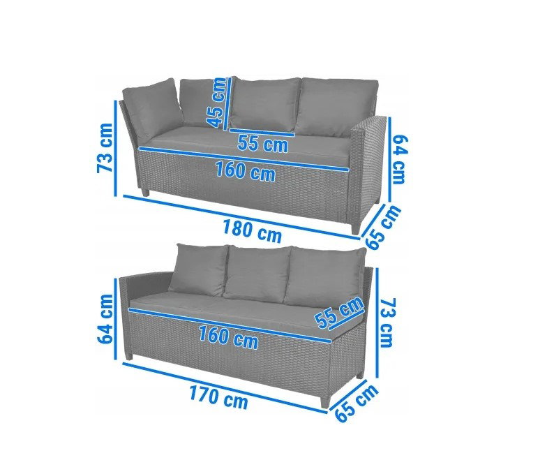 - Wymiary sofy 2: 170 x 65 x 73 cm