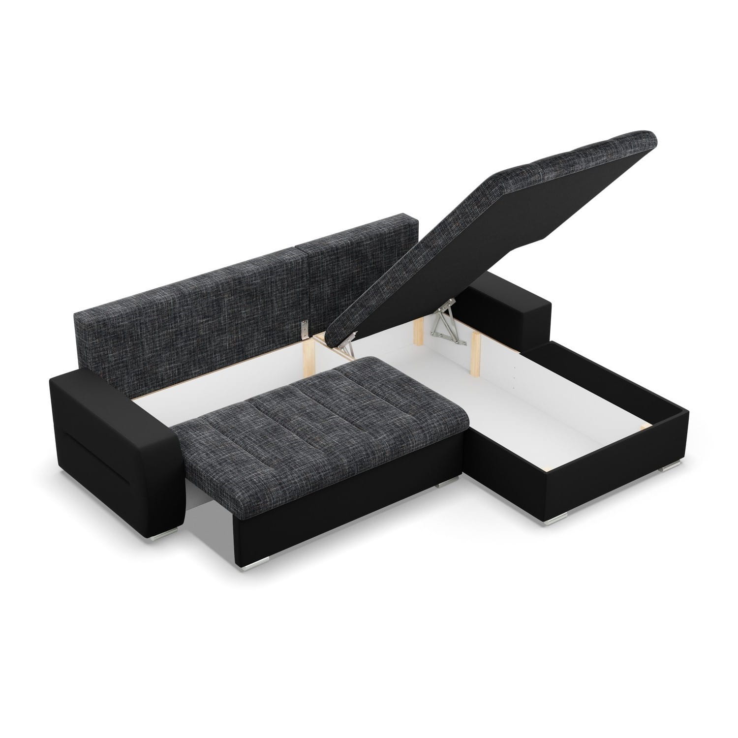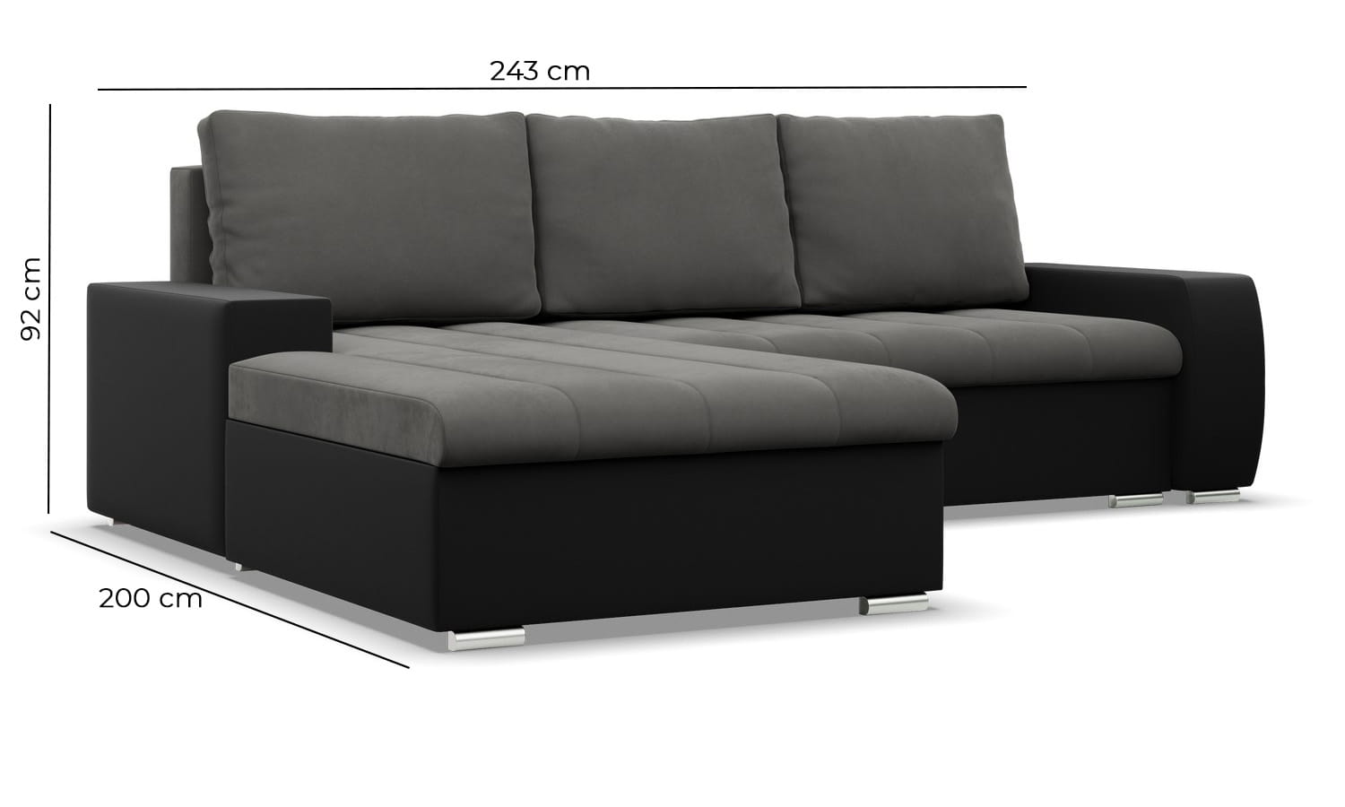 Narożnik do salonu, prawy, Sereno, 243x200x92 cm, czarny, ciemny szary. Zadbaj o kącik wypoczynkowy z komfortowym narożnikiem Sereno! Nowoczesny narożnik z funkcją spania świetnie sprawdzi się w dużym salonie lub pokoju dziennym, oszałamiając swoją estetyką. Klasyczna forma narożnika połączona z funkcjonalnymi rozwiązaniami technologicznymi w postaci podłokietników, luźnych poduszek i dużych pojemników na pościel będzie idealną ozdobą i jednocześnie miejscem spotkań z rodziną i przyjaciółmi.