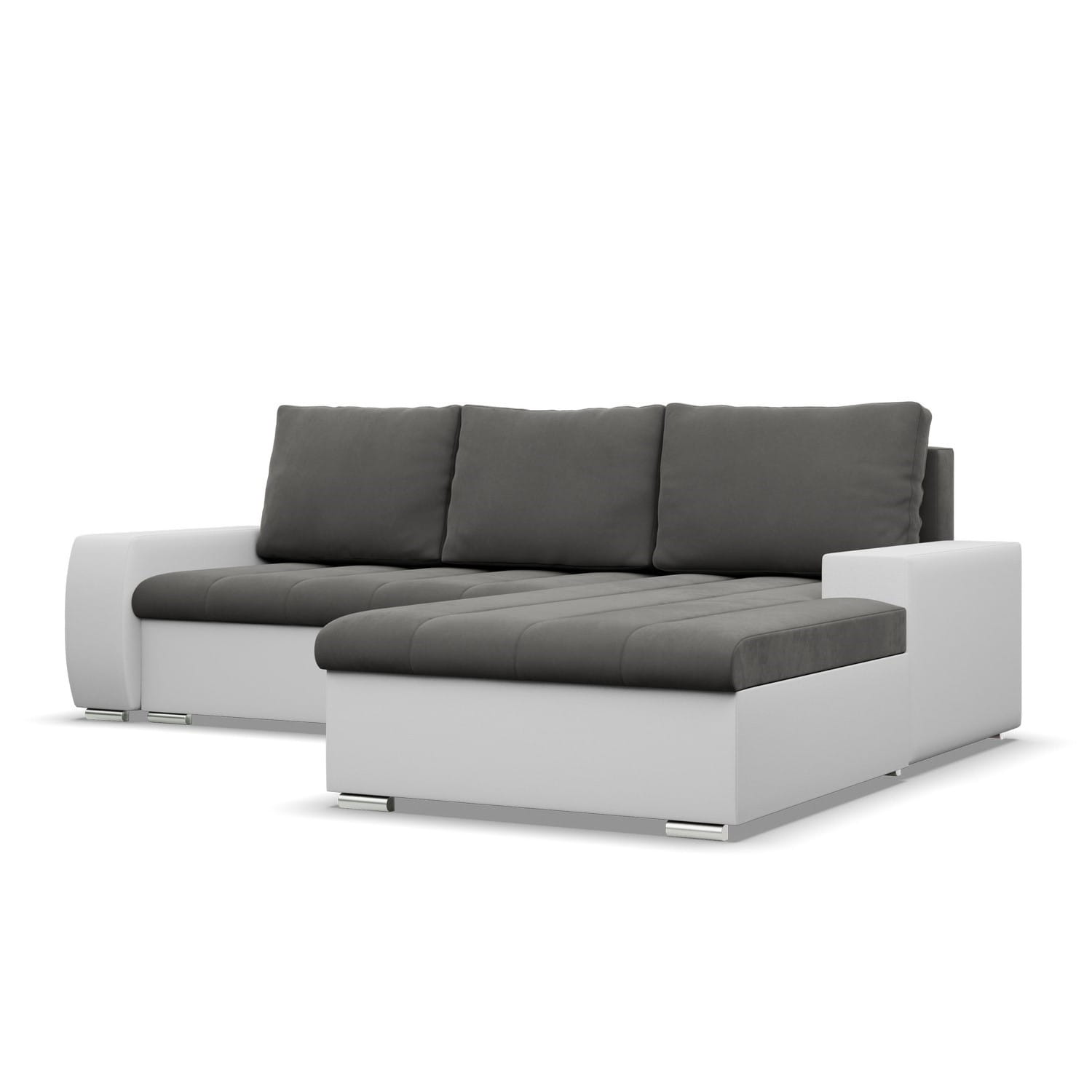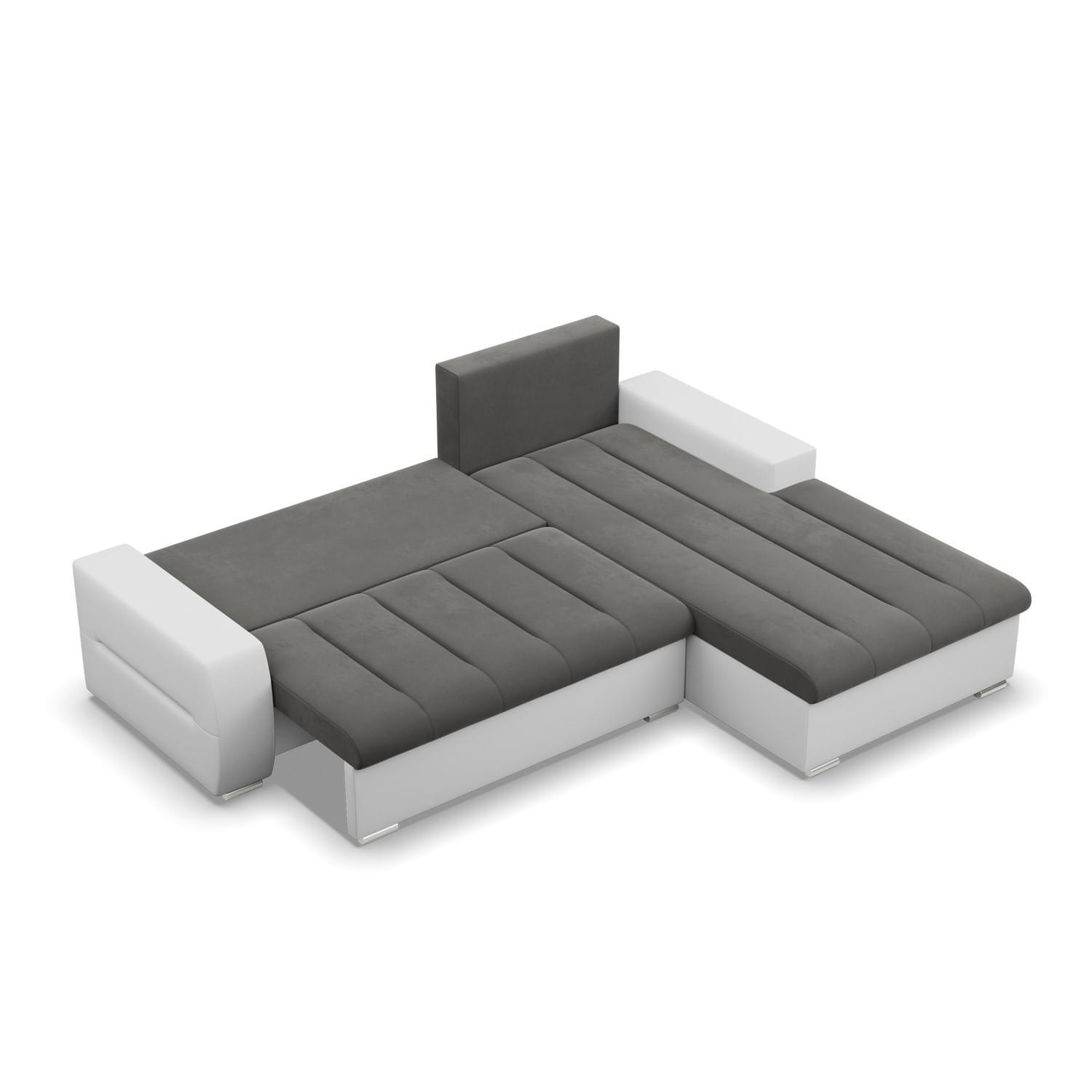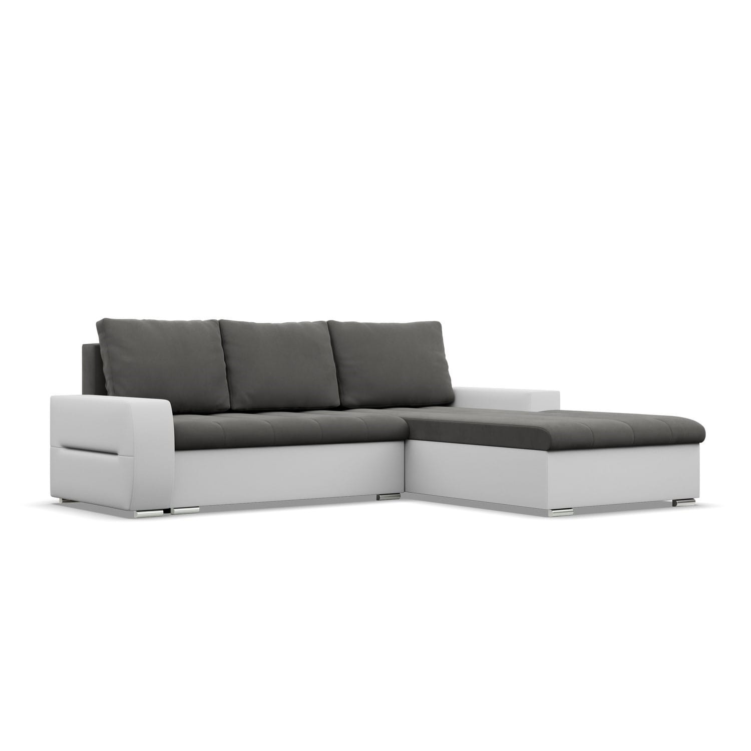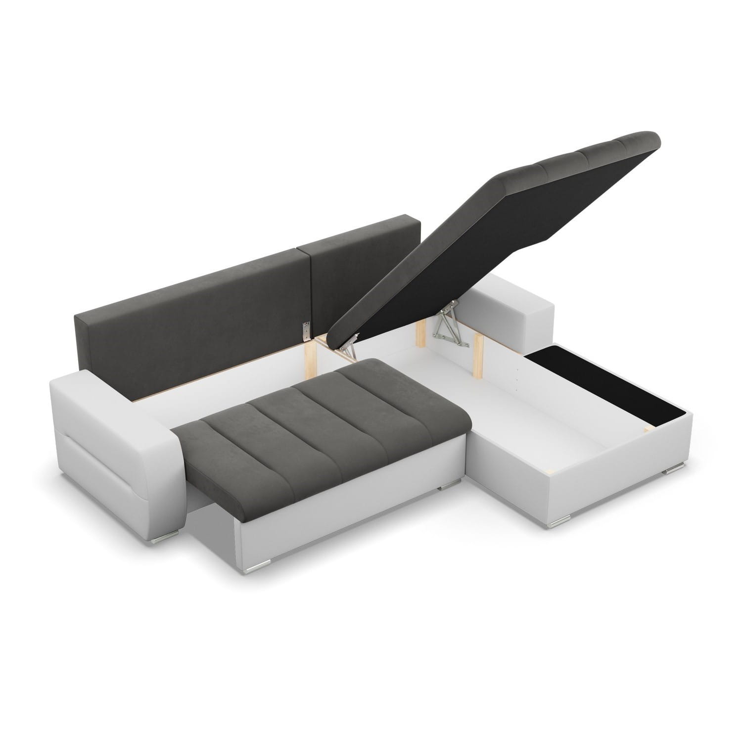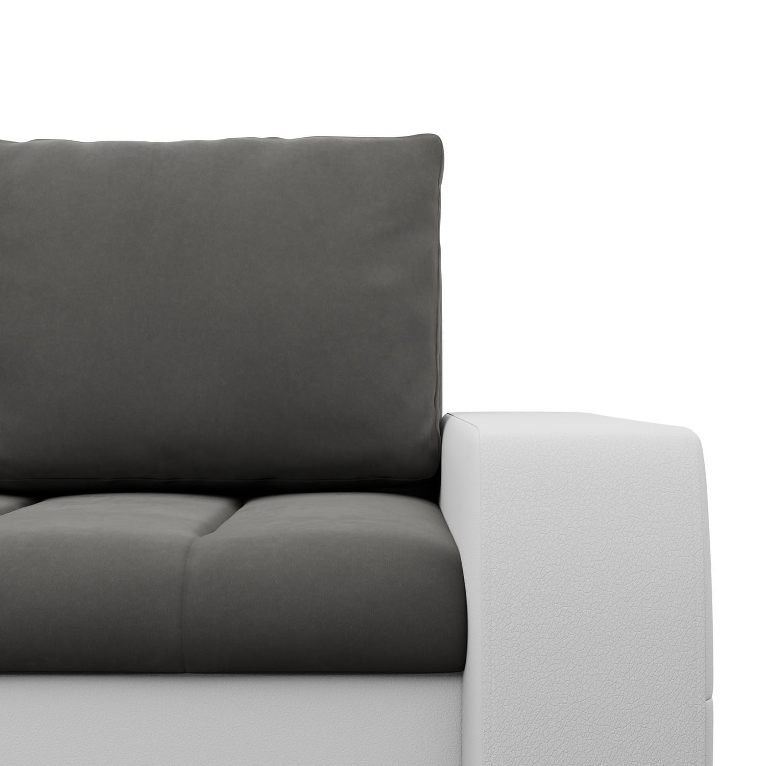 Narożnik, prawy, Sereno, velvet, ekoskóra, 243x200x92 cm, ciemny szary, biały. Zadbaj o kącik wypoczynkowy z komfortowym narożnikiem Sereno! Nowoczesny narożnik z funkcją spania świetnie sprawdzi się w dużym salonie lub pokoju dziennym, oszałamiając swoją estetyką. Klasyczna forma narożnika połączona z funkcjonalnymi rozwiązaniami technologicznymi w postaci podłokietników, luźnych poduszek i dużych pojemników na pościel będzie idealną ozdobą i jednocześnie miejscem spotkań z rodziną i przyjaciółmi.