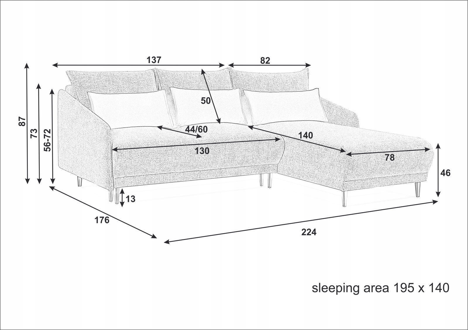 - Funkcja spania: 208cm x 130cm